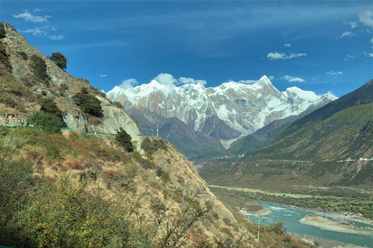 公路沿着雅鲁藏布江朝着大峡谷纵深而去,并随着山势变化不断拔高。由于地处大峡谷沟北,故此行驶间时常都可正面看到南迦巴瓦峰雄伟的身姿。