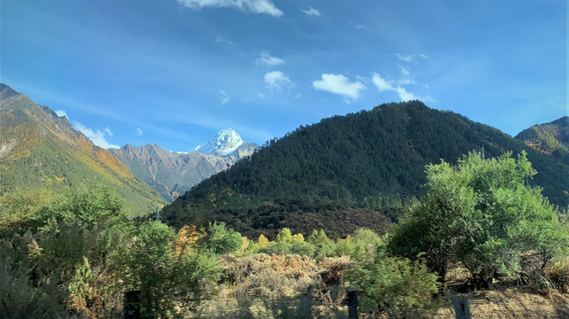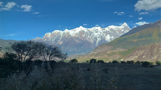 过了佛掌沙丘,路面两侧山势开始变得险峻起来。伸长脖颈一直在期望尽早看见南迦巴瓦峰,王导充满自信的告诉我转过这个弯就可看到。他边说边打方向盘,果不其然,公路左侧天边出现一座雪山,巨大的三角形尖峰直指苍穹,这正是我日夜筹划想要看到的圣山啊!