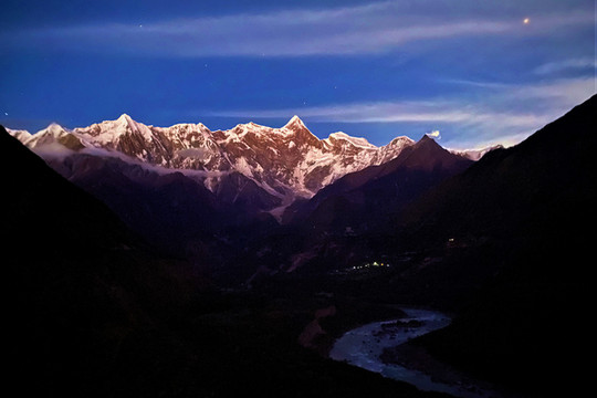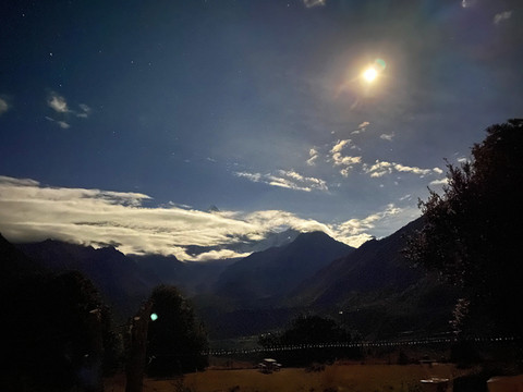 可能是太兴奋了,躺在床上辗转不能入睡,索性披衣来到屋外。此刻夜深人静,但见皓月当空,一抹白云似纱巾般遮盖在南迦巴瓦峰上,看来天人也进入梦乡矣。