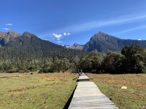 木栈道并不很长,漫步不足一公里,就看见了密林外面的高山。