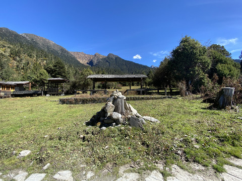牧场出口处耸立着一座在树根桩上搭建的玛尼堆,周边还可见到更粗的树根桩,这一切说明,南伊沟以前的环境不是这样。