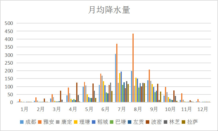 7月和8月各地月均降水量均超过100毫米,成都和雅安月均降水量更是超过了300毫米。