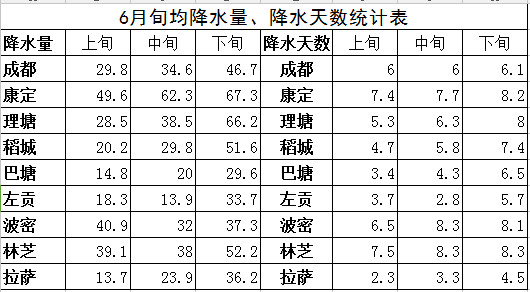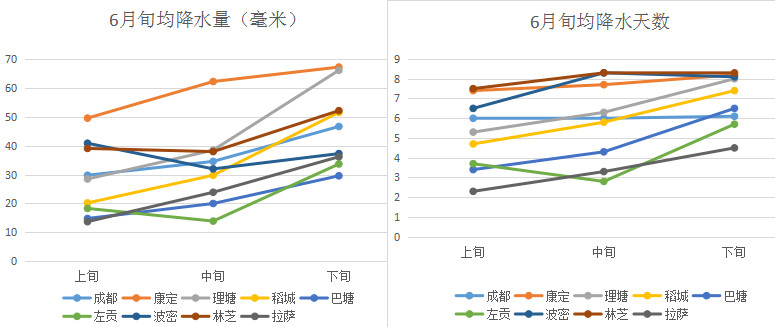 其实,严格意义上来讲到了6月下旬,川藏线就已经进入了雨季。6月下旬各地旬均降水天数已经达到了6~8天,降水量已经在50毫米左右了。