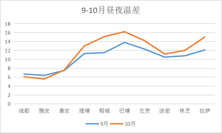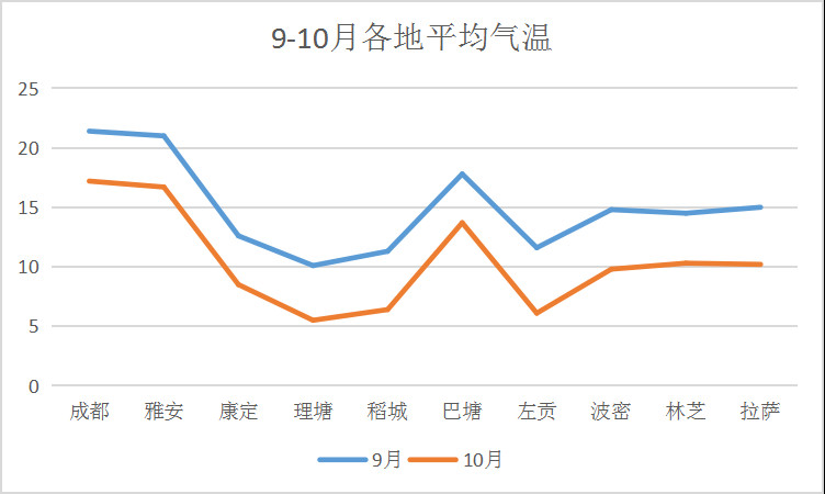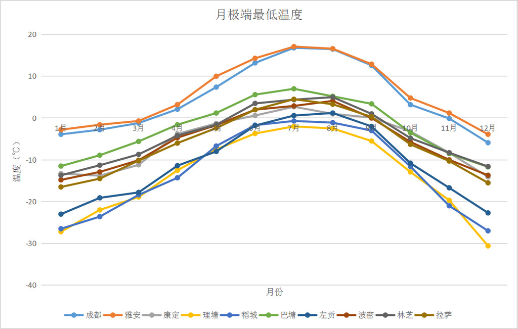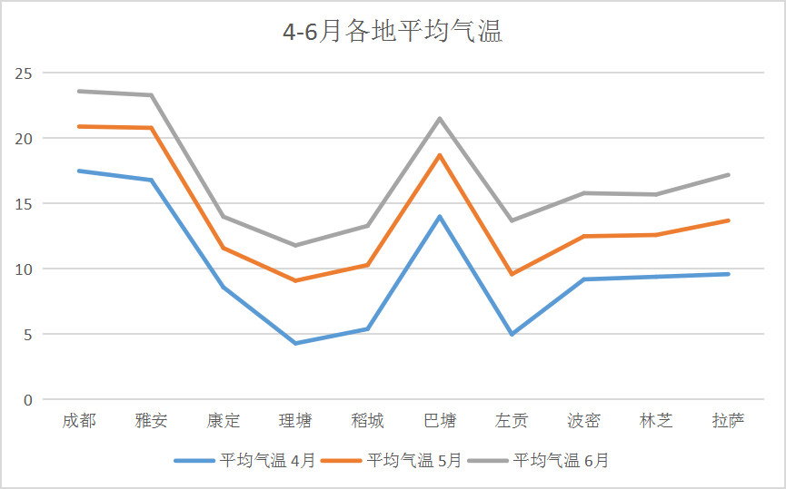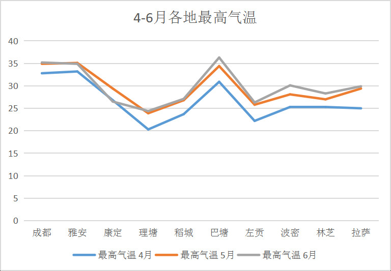 4月,成都、雅安等低海拔地区极端最高温度达到了30度,5-6月理塘、左贡等高海拔地区极端最高气温在20-25度之间,由此可知。沿线各地气温差异较大。