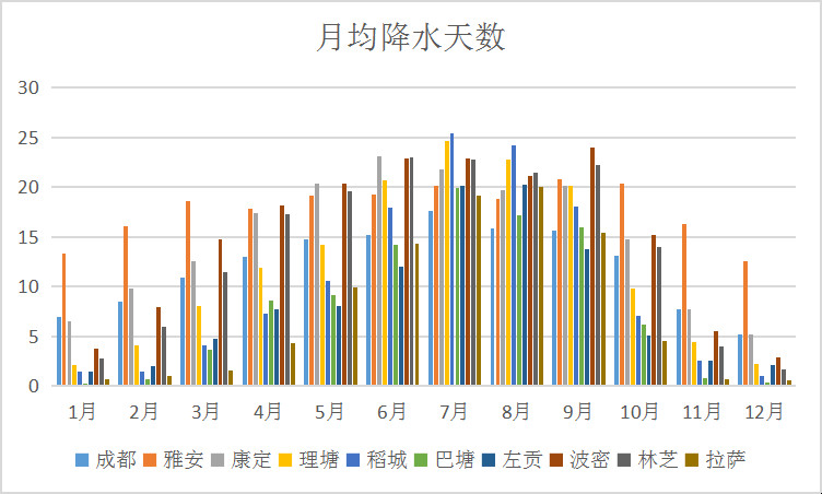 7月和8月各地月均降水都在20天左右,即使降水天数相对最少的成都,7月份月均降水也达到了17.6天,8月份月均降水达到了15.8天。
