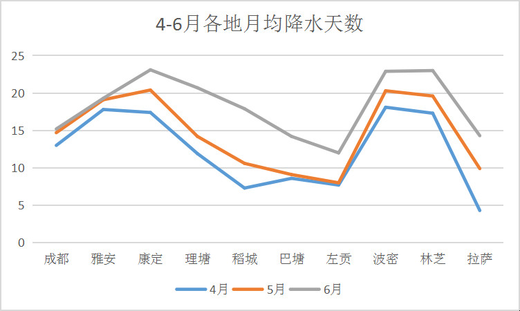 4~6月川藏线各地月均降水天数多小于15天,但是康定、波密、林芝等少数地区降水较为充沛,5月月均降水天数在20天左右,6月月均降水天数在23天左右。朋友们路过该路段需多加注意。