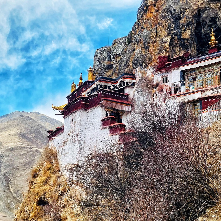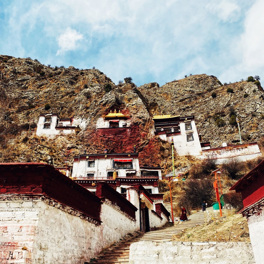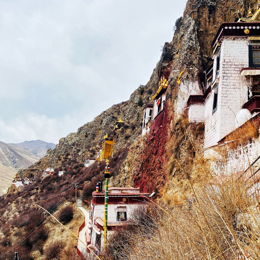 第二天(4月23号)我们三个驱车前往拉萨西边的扎叶巴寺,上山的都是坑坑洼洼的弯路。不过寺庙很美,建在陡峭的半山腰上。