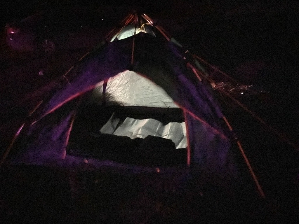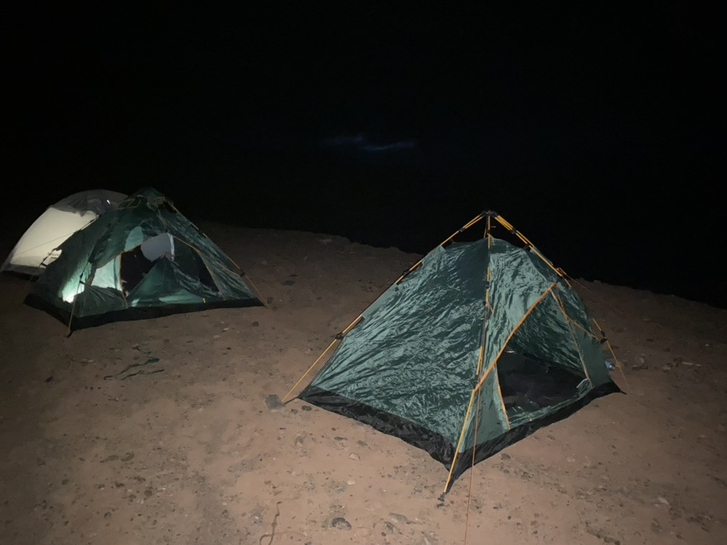 景区内不让露营,把我们赶了出来,于是我们开车沿着马路兜了挺久,想找一处风小的地方露营过夜,这里平均海拔是5000米左右。天黑后辉哥找到了一个看似还不错的平地,在马路边,于是我们下车开始搭帐篷,开着手机照明灯,这是我们搭好的帐篷。绿色两个是网购的便宜帐篷,很简陋,经不起大风。
