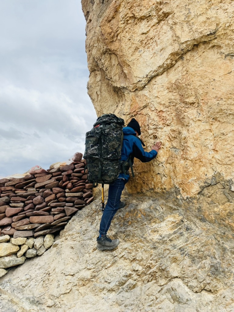 这个背着70升骨灰级登山包的就是辉哥,非常虔诚的在和石头对话。