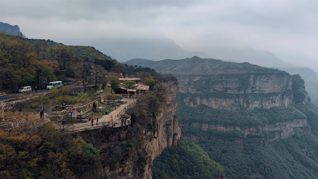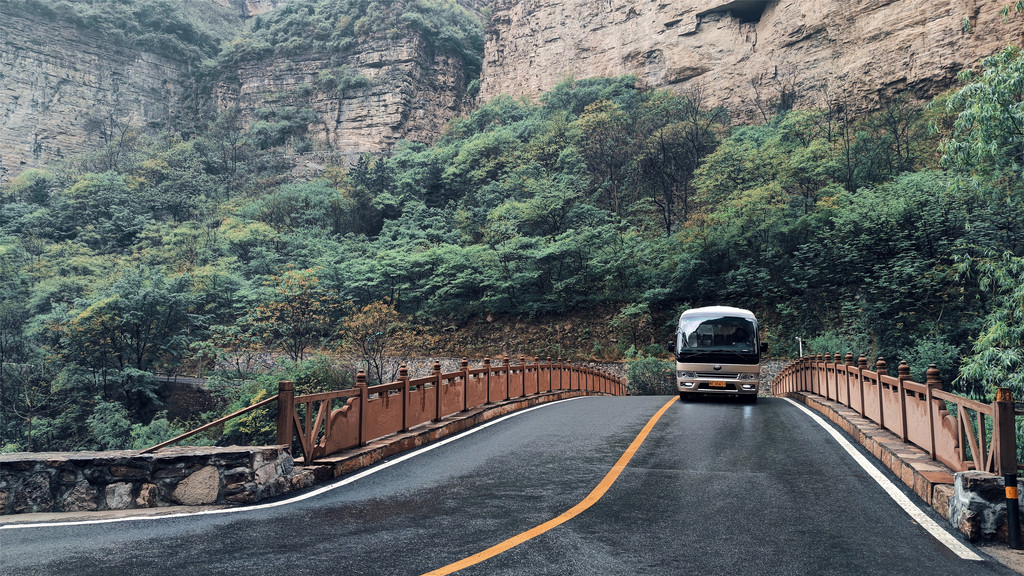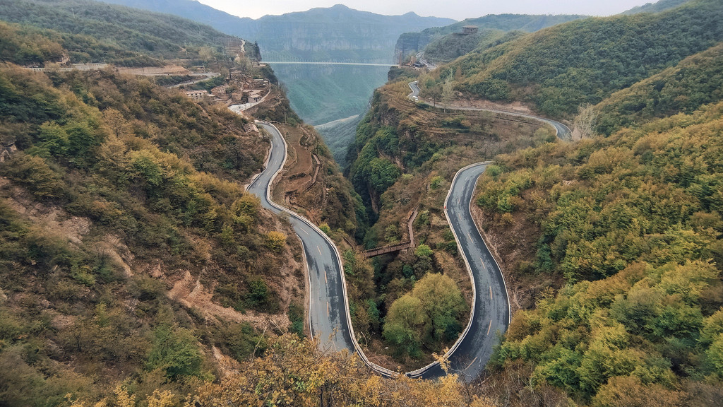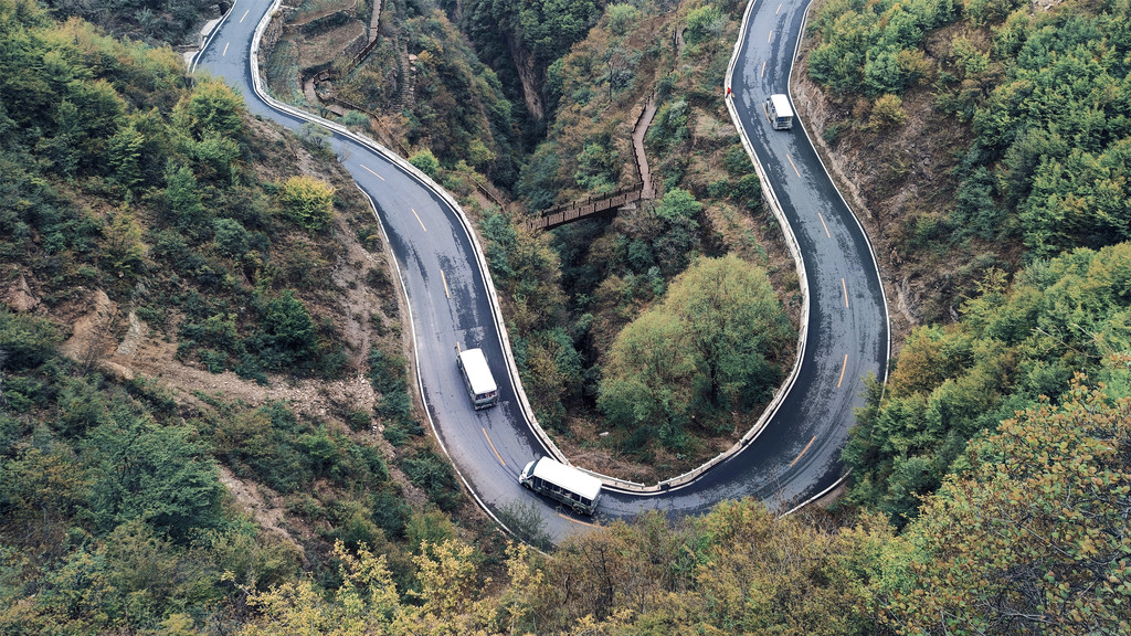 从山脚下坐电瓶车出发,15min直达最佳观景点。从这个位置拍摄太行天路,镜头刚好可以将山谷两侧的道路全部收入,形成一个倒“几”字形,车辆穿行其中,从肉眼可及到消失在视线中,短短几分钟的过程却令人非常享受。