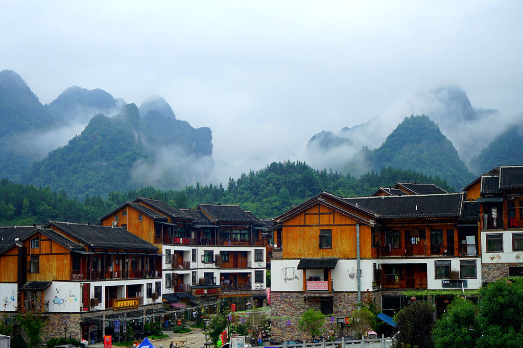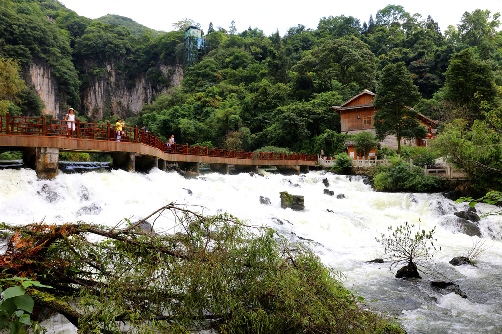 清晨,推开客栈木窗,远山烟雨蒙蒙,好似江南。匆匆吃过早饭后,赶紧进入小七孔景区东门入口,换好预约的观光车票,景区入口处已是人声嘈杂,人群聚集了,排队乘车直接前往位于景区西门卧龙潭方向。
