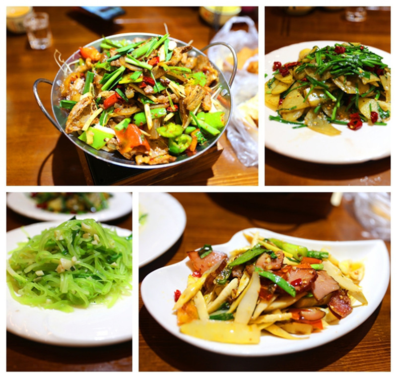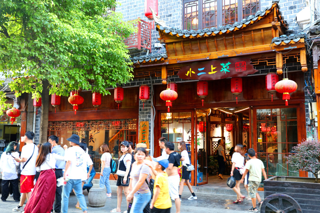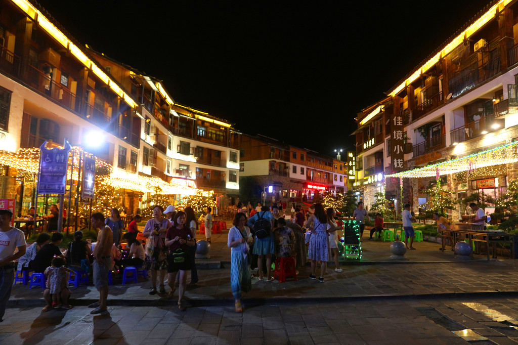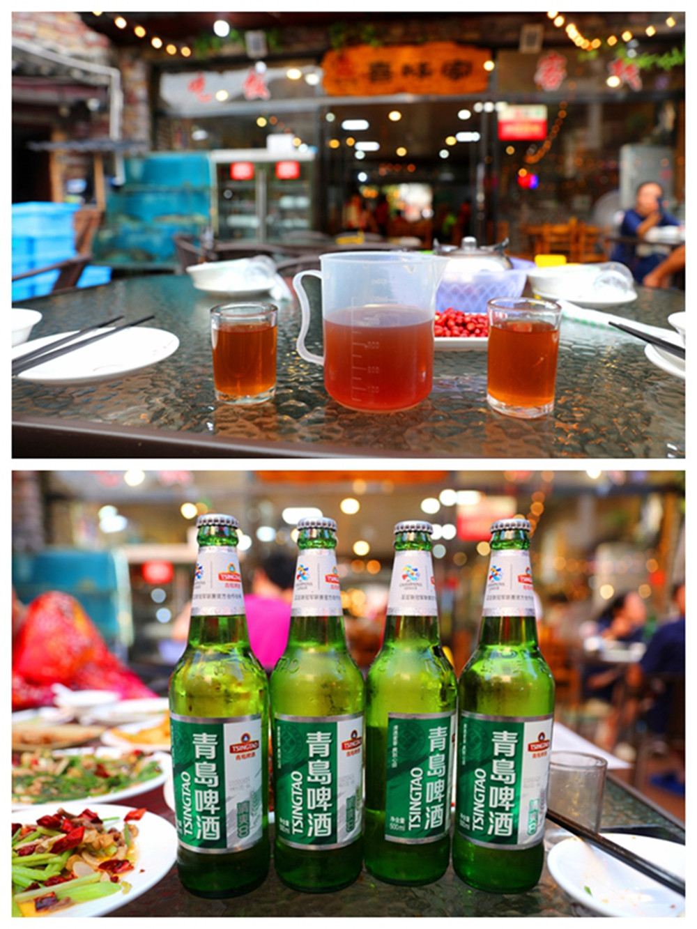 此刻辘辘饥肠的我们办好入住后赶紧找吃的,小镇里餐馆客栈林立,灯光璀璨、霓虹闪烁。灯箱上打出各种民族风情特色菜以及各类烧烤小吃,随便找了家看上去人气很旺的店,特意找了临街室外的桌子,点上几样当地特色风味美食,天光月明、晚风送爽、美景美食,疲惫一扫而光。