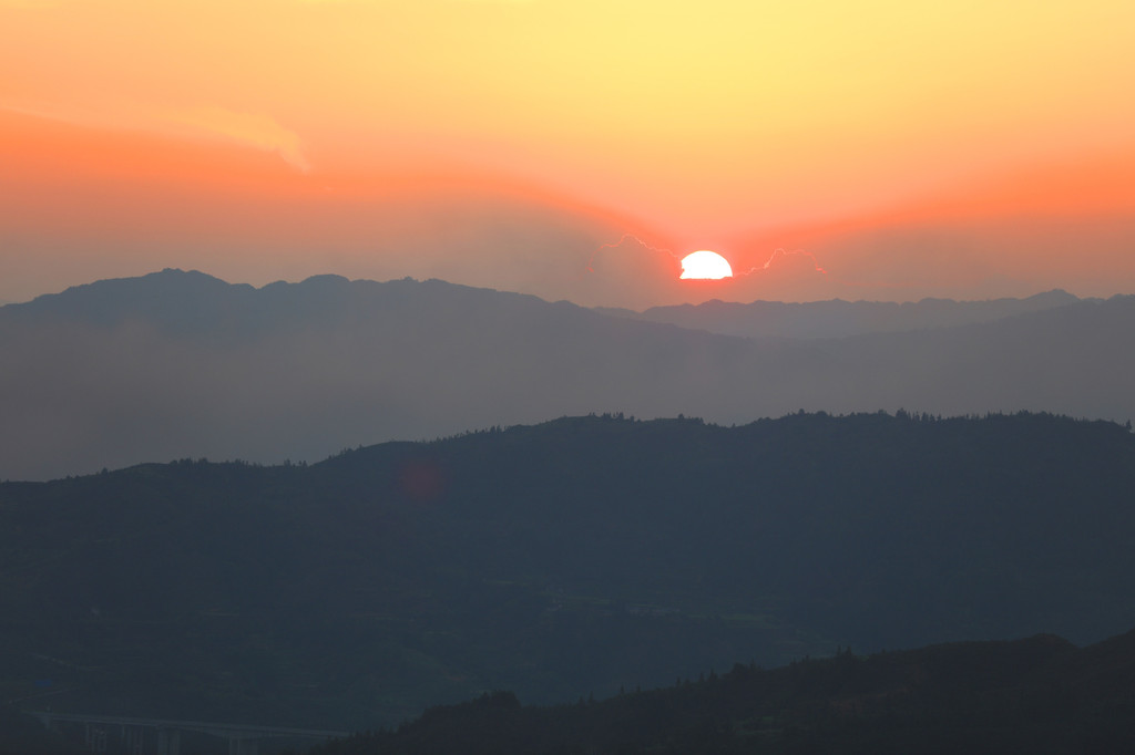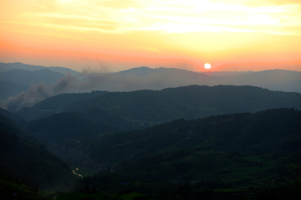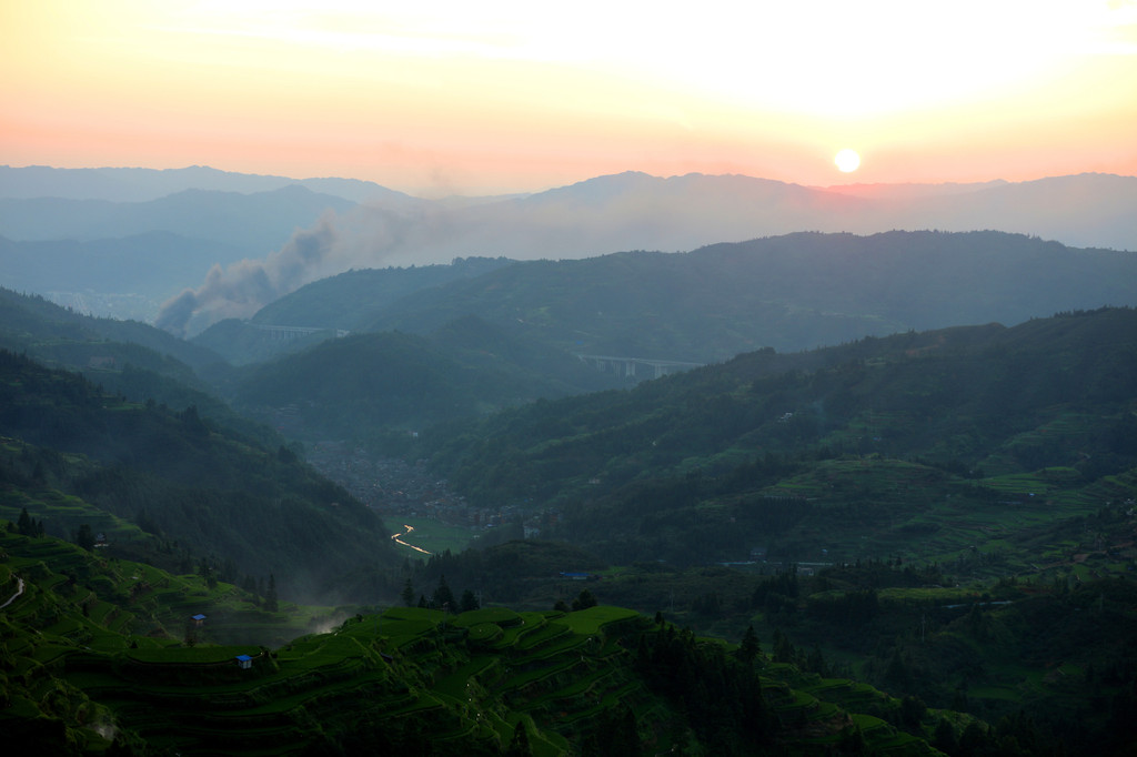 在寨中转悠了将近一小时,一看已临近日落时分,赶紧回到刚才下车的寨外一观景平台处,静静地等待夕阳西下的来临。眼前的景色让我们沉醉:大山环绕周围,远处薄雾缥缈、鸟鸣虫唱;万顷稻香梯田色彩分明、纵横交错;郁郁葱葱的山林和稻田中点缀着富有侗族风情的古老民居……一幅自带滤镜的诗意田园美景映入眼帘,傍晚的太阳已经西下,把刺眼的光芒收了回去,一望无边的天空一片湛蓝和天边那柔柔的红晕,大山在夕阳的映射下显得非常美丽, 太阳慢慢下降,当第一抹夕阳照亮了万顷稻田,稻田顿时变得金灿灿的,当第一抹夕阳照亮了树杈,树杈变的金绿金绿的,当第一抹夕阳照亮了远方的树,树变的朦胧的金色 ,太阳的形状从圆形半圆形,到不规则的形状,越来越小,眼看即将消失,太阳仿佛无限留恋这个世界,努力把光照射在大地上,仿佛要为世界多增添一些光和热,它拼尽全力,迸射出今天的最后一缕金光,就消失在群山的怀抱中,在山巅欣赏了一场惊艳的落日后,最后一班公交车的司机催促我们下山了。