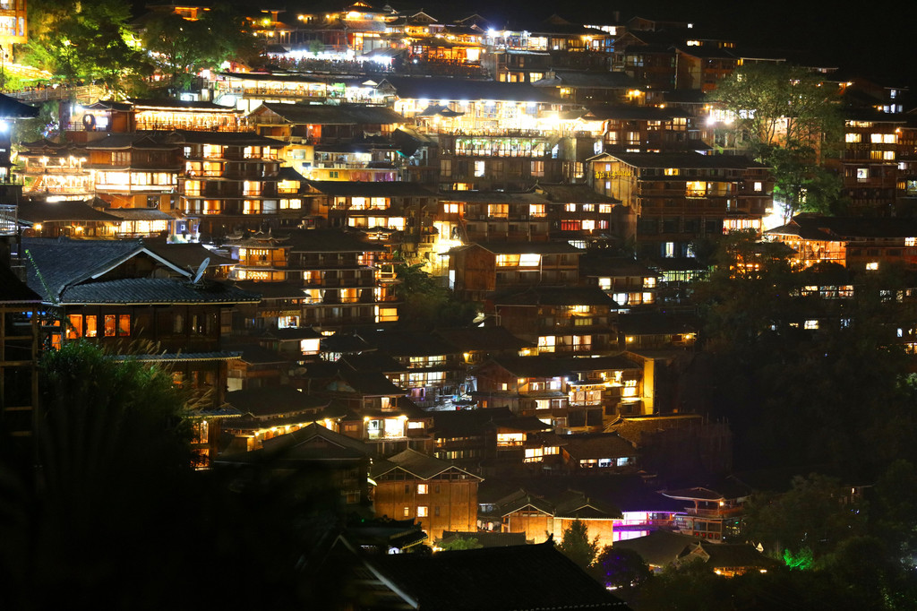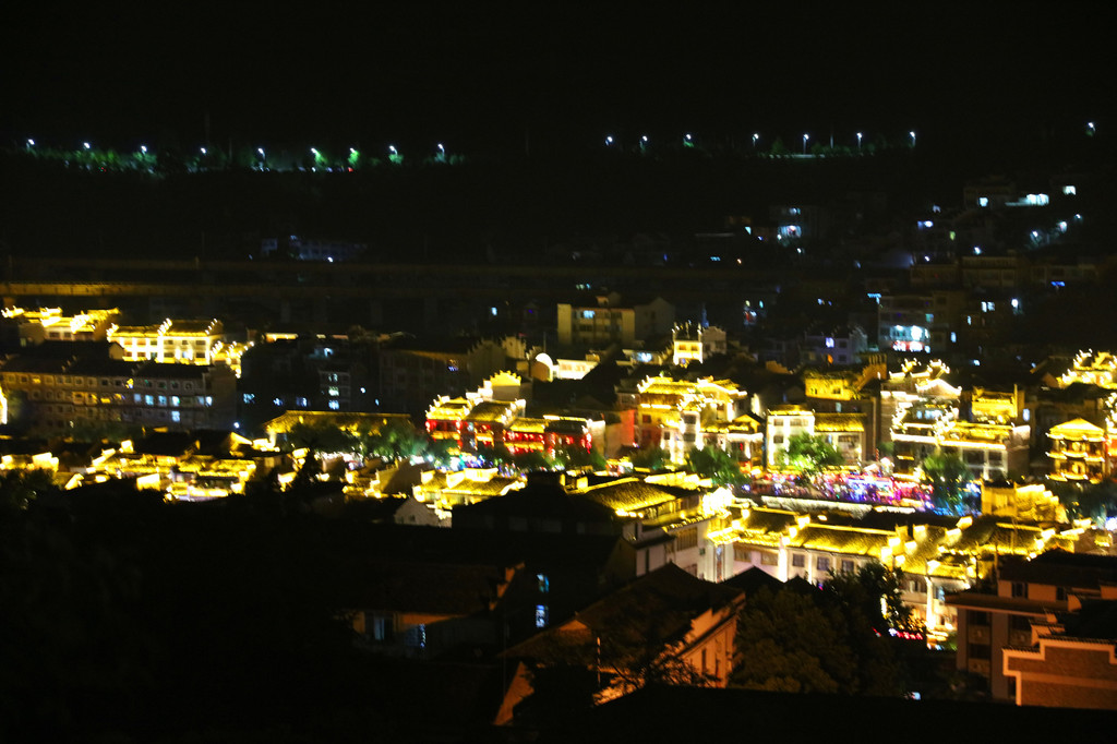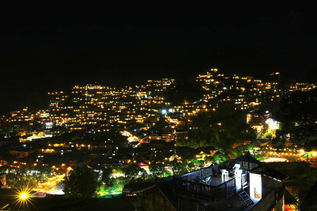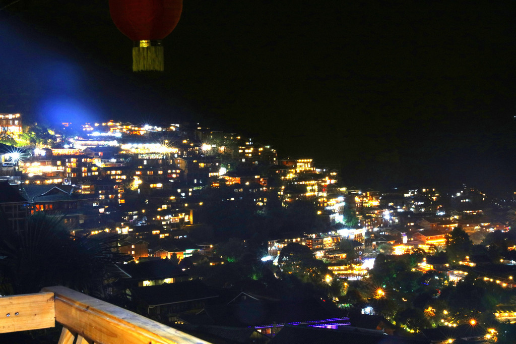 晚餐间,暮色渐近,随着光线变暗,家家户户门前的灯陆陆续续点亮,万家灯火的吊脚楼,层层叠叠鳞次栉比,让人如入异界世界,酒足饭饱后回到客栈,拿起三角架,来到客栈的观景平台,凭栏远眺,整个苗寨,万家灯火点亮了大地,夜晚的苗寨无疑是最令人震撼的,万家灯火通明,犹如繁星点点,好像在与天上的星星比谁亮!俯瞰整个苗寨,华灯四起、流光溢彩,建筑、桥型、流水,这属于晚上的苗寨风景,有着别样的风情。