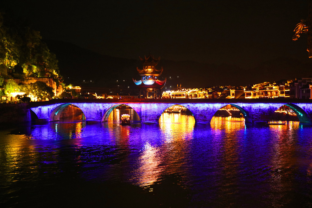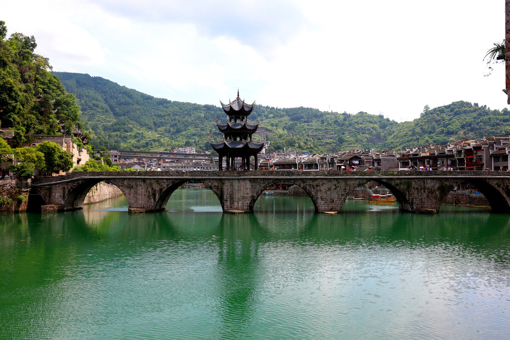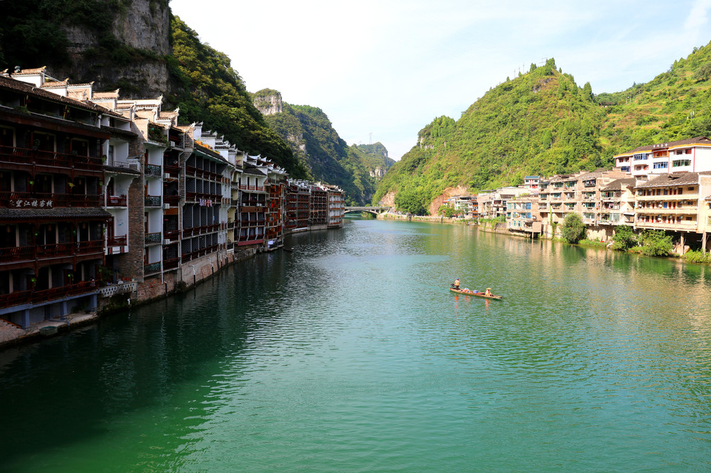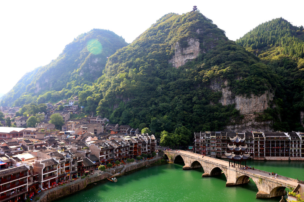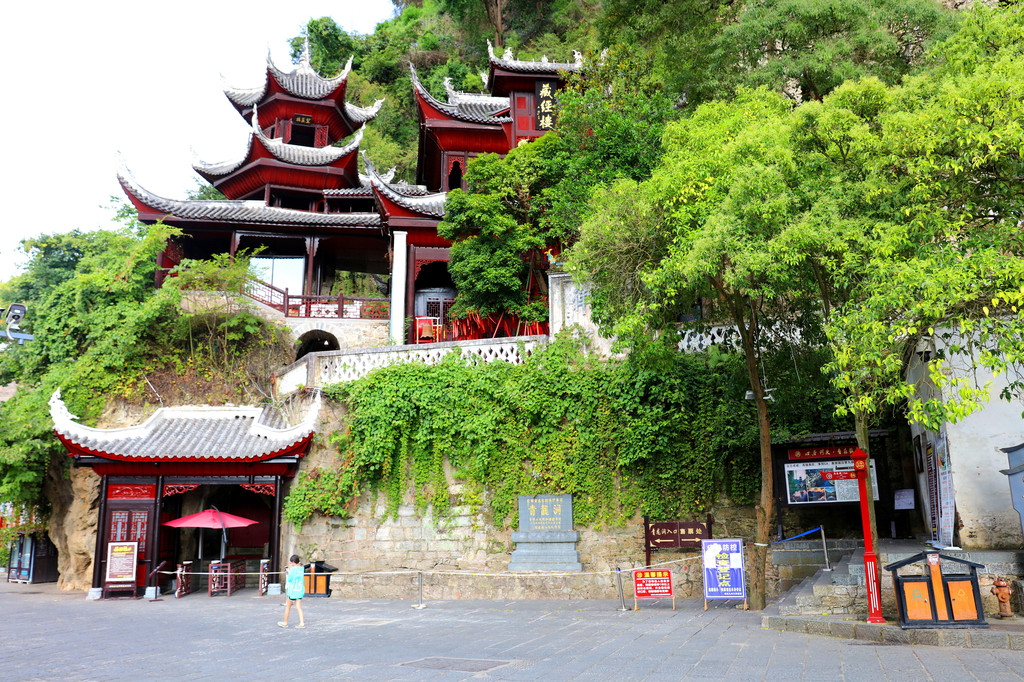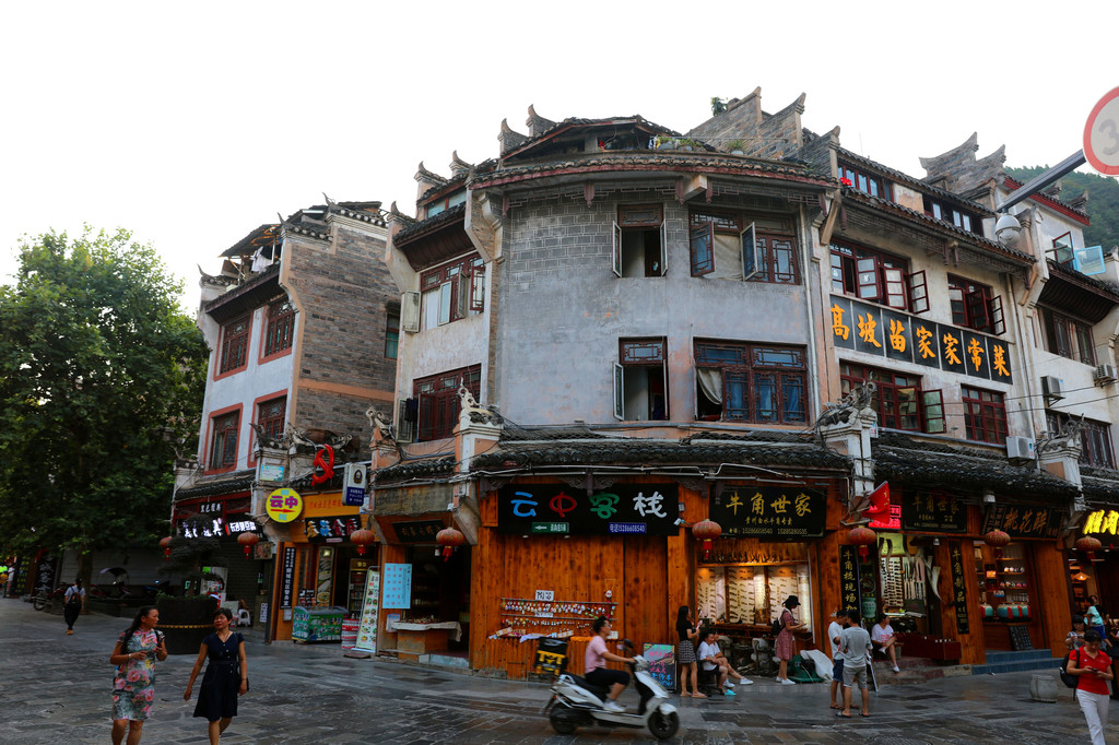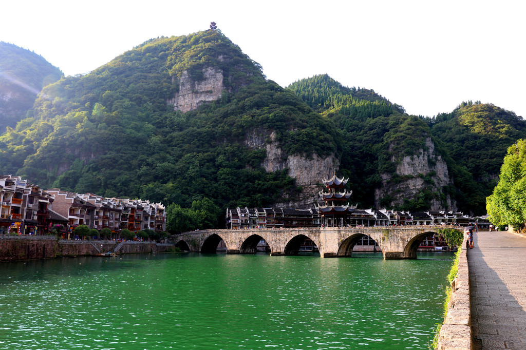 等到灼热的阳光稍退烧,我们决定出门去逛逛古城,一碗百年老店的鸡丝豆花首先了我们让记住了镇远的味道。和贵州多民族风彩不同,镇远古城在贵州是个另类,这里看上完成是中原汉族风貌风情。座落在舞阳河上的祝圣桥的桥墩建于明朝,桥体则建于清朝,整座桥由青石砌成,在为康熙帝祝寿改名为祝圣桥之前,还有一个名字叫做溪桥,光绪四年,增建了祝圣桥上的状元楼,也叫做魁星阁,走在古桥上,我们犹如穿越时空回到了那个年代........走下祝圣桥,河的南岸就是青龙洞,我们非常辛运,前段时间青龙洞一直在维修,7月20日才恢复开放,出示事先预约的免费门票信息,并出示身份证入内。青龙洞其实是一组拥有500多年历史的宗教古建筑群,集合了佛道儒等各家元素,采用了吊、借、附、嵌、筑等多种建筑工艺在陡峭的山崖上建造了紫禅书院、中禅院等亭台楼阁,甚至因为身处苗侗多民族地区的关系,巧妙筑造了苗侗的吊脚楼干栏式建筑用来眺望舞阳河,集中了山水楼阁的精华之美,被称作“南方悬空寺”和贵州古建博物馆。我们入内后便依次沿着亭台楼阁向上攀爬,四周贴壁临空,五步一楼,十步一阁,翘翼飞檐、雕梁画栋。这些古建筑依山因地,与悬崖、古木、藤萝、岩畔、溶洞天然合成,融为一体,真是巧夺天工,我们在青龙洞寺藏经楼,玉皇阁这几处高点,凭栏远眺,一江清水舞阳河S形穿城而过,而青龙洞对望着600多年历史的祝圣桥,祝圣桥又倒映在舞阳河中,形成一幅和谐的古城画卷,倒映在舞阳河碧水中的青山与古城的明清建筑群交相辉映,别有风味,可以感受到镇远这边既有江南水乡般的秀美,又因群山环绕,有着西南山地风貌的雄壮。