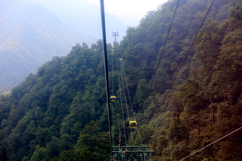 中午十二点我们准时刷身份证入景区,景区公交车站排着长长队伍,梵净山的景区入口距离实际登山起始点“鱼坳”还有约10公里的山路,外来车辆不得入内,这景区公交车必须乘,虽然景区门票已免,但往返的小巴还需付费,每人20元,好在景区公交车很多,一辆辆接一辆,很快我们就乘上了车,观光车一路盘旋而上,山间的植被真是令人目不暇接,声声入耳的都是时大时小的潺潺水声,可能不久前下过大雨,公路边的溪流湍急奔涌而下,不时看到水流的漫过道路的踪影。景区公交车来到终点“鱼坳”,这里是登山起始点,第一段是从“鱼坳”到山顶平台。这段可以选择自行徒步攀登或者坐缆车,我们看攻略上说如果徒步攀登,那么要做好攀爬8000多级台阶的准备,这段俗称“万步云梯”,单程差不多4小时(往返8小时),而缆车最后是到“万步云梯”6300级处(“万宝岩”),之后还需自行徒步四十来分钟到达山顶,那我们肯定和大部份游客一选择缆车,缆车的往返价格是160元,单程时间为十分钟左右,既省时省力,还可以俯瞰梵净山连绵的自然风光,景区公交车站与缆车站无缝对接,虽然已实行分时段预约入景区,缆车站内还是人满为患,人贴人,广播里让大家保持安全距离根本就不起作用,还好缆车的运载能力比较强,等候不久我们就乘上了缆车。缆车进入索道后,开始加速以很陡的坡度向上升,索道长3411.32米,海拔高度差1193米,这索道爬升高差较大,开始还能从空中俯瞰一下梵净山的茂盛森林,忽地就上行到海拔2000米之上了,缆车在原始森林上空滑翔,缆车外已是风起云涌,森林、云海就在脚下,回头看看身后的层层山谷,一串交错叠障的峰谷绵延, 时而是云海波涌浪滾,时而又风卷雨雾遮天蔽日,感觉腾云驾雾似的,乘坐10多分钟到达缆车上站,从缆车里出来,呼呼的水雾弥漫开来,阵阵凉风也袭来,一扫刚才在山脚下的酷热,顿觉浑身舒畅,这毫无征兆的天气让人完全摸不清梵净山的头绪,沿着修好的台阶栈道开始向上爬,我对爬山比较抗拒的,但没办法,这一段必须爬,四周迷雾茫茫,几步之外什么都看不见,只能闷头直行向上,四十分钟后爬完一千多级台阶后气喘吁吁地终于来到山顶平台,眼前正对着的,就是梵净山最为著名的奇石阵了,梵净山乃武陵山脉的主峰,和这一地区多喀斯特熔岩不同,这里的岩石经过地质运动,多为质地坚硬不易溶于水的变质岩,而且更多的是横向沉积,所以在梵净山等看到的各种天外飞仙般的巨石,无一例外地呈横向层层叠叠地向上堆积而成,最为著名的当属蘑菇石,这是梵净山也是贵州的标志性景点,名字来源于形象,上大下小,形似蘑菇,高约十米,亭亭玉立,看似摇摇欲坠,一触即倒,实则岿然不动,兀立于这山上已有10亿年以上历史,见证着岁月的流逝与地质的变迁。10多亿年的时光,我们可以想像,却无法参予其中,而此刻我们能做的就是对着蘑菇石猛拍,证明自己来这里打过卡了,此时的蘑菇石四周云雾弥,使人产生幽邃、神秘、玄妙的幻像,因蘑菇石前平台面积不大,挤满了游客,想拍一张照片很难。梵净山有三个顶,一个叫蘑菇顶,一个叫金顶(老金顶),一个叫红云金顶(新金顶),看攻略说在蘑菇石前平台应该能看到左手边的红云金顶和右手边的老金顶,两金顶遥遥相对,可此时四周只有漫漫迷雾,不见一丝新老金顶痕迹,现在梵净山出镜率较高的那个顶就是红云金顶,云雾缭绕中一座山峰突兀其中,金刀峡将山尖一分为二,由一座小桥相连,左右各建有一所小庙,很好的还原了人们对于“天空之城”的想象,大部份游客也都会选择攀登红云金顶。当我们正对着漫天迷雾彷徨时,突然一阵风吹过,置于云端的高高耸起像一只巨大惊叹号的红云金顶在云雾缭绕中若隐若现,恍若仙境,而右手边的老金顶也在云雾中时隐时现,“转眼风云相会处,凭空移步作神仙”,不管季节,无论早晚,梵净山一直在弹奏云的狂想曲,十天里,八天有大雾,雾起处无论季节,不管晦明,来无定向,去无定时,一切无意无心,一切自在自然,千奇百怪,尽在一瞬,面对突如其来的惊鸿一瞥,赞叹在心中油然而生,哇,原来还能有这样的风景,此刻只有赶紧拿起手中的照相机,按下定格键,把散落在眼前的微光碎片,拼凑在一起。