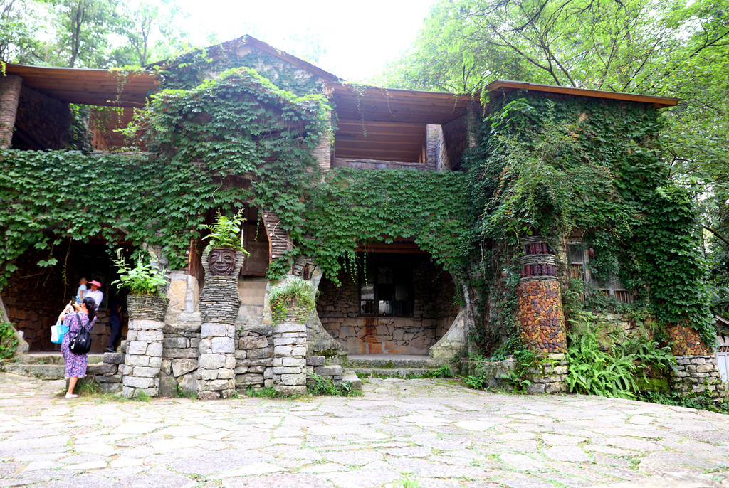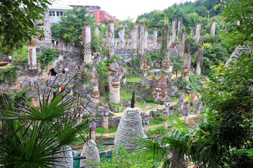 来到夜郎谷附近,这里属城乡结合部,环境看上去有点败破,但走进夜郎谷的那一刻,仿佛便离开了尘世,进入一个神秘的世界。在大门口,远远就可以看到伫立着石砖搭建而成的石柱,石柱上是生动形象的夜郎脸谱,进入景区后,才发现隐藏在树木后面的石头王国才更吸引别人的目光,一开始的那几根石柱只是冰山一角。我们仿佛穿越到了几百年前的原始部落,彰显着神秘和夸张的石头王国带着我们踏入了另一个时空。粗糙石头堆砌起来的拱形门洞,一座座圆柱形的石柱排列在山壁前,有的只是装饰,有的则被拼凑成不同的脸谱,加上脸谱表情的石柱马上活灵活现起来,不同的石头人面部都有不同的表情,各种各样造型的雕塑,有的是用石块垒起,有的是用陶瓷碎片堆叠,将大地艺术体现的淋漓尽致、并充满着夜郎古国的神秘的地方,却是由一个人投资打造而成,1997年人称“旅美艺术家”、“漫画大师”的宋培伦,放弃了各种让自己衣食无忧的身份,在贵阳花溪区的这个山谷,着手打造自己心中的“夜郎国”,当时已年逾花甲的他,借款300多万,花费了生命中的22年,精心雕琢下留给了人们这一方奇幻的艺术之地,夜郎谷占地20万平方米,规模不算大,对于我们这些艺术门外汉,用1-2小时差不都能把主要的那片河谷逛完,但倘若用艺术家的眼光细细琢磨这些雕塑,大概半天时间也不够。