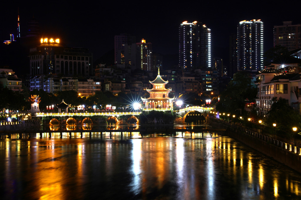 回到宾馆附近一看,夜幕下的甲秀楼,灯光璀璨,倒影水中,更加美丽撩人。赶紧拿起三角架带着一丝小醉意,兴奋地去拍甲秀楼夜景,夜晚的甲秀楼流光溢彩,南明河上水影绰绰,历史感厚重的古建筑和现代灯光的结合同白天是完全不一样的感觉。