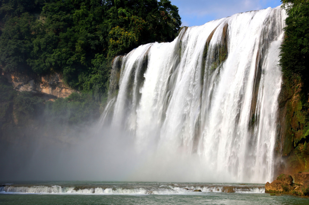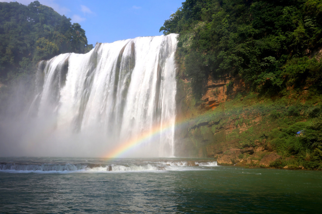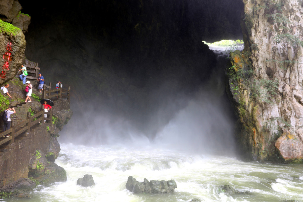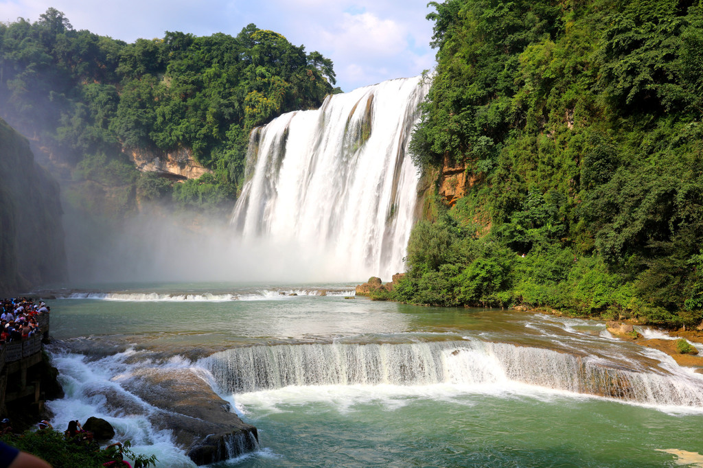 二十分钟后我们乘观光车来到核心的大瀑布景区,一看到处是摩肩接踵的游客,这里是疫情发生后我看到旅游景点游客最多的地方,可想而知,正常时期、黄金周、法定节假日黄果树游客流的规模有多恐怖了。到达大瀑布景区后,可以选择乘坐电梯前往”黄果树大瀑布“,单程30元,往返50元。也可以步行前往,因为黄果树大瀑布是少见的可以从上下左右前后六个方向都能看的瀑布,而且从上方拍摄大瀑布的全景无疑是最好的角度之一,因此我们选择步行下山,这样路上就可以从侧方看到大瀑布,每年的6-8月是黄果树瀑布景区的汛期集中期,汛期期间,黄果树水流量激增,瀑布水势更加浩大,这时便是黄果树瀑布最壮丽的时期,看来我们来对了时间,我们沿着白水河边步道向大瀑布方向行进,虽然游人如梭,但充满期待,因有树木掩映,瀑未见,声先至,轰然的瀑布声就从远处传来,透过树丛,前方高高的山腰之上,一道白川倾然而出,三十多米宽的一道白练犹如巨型白璧挂于山前,瀑布飞泻而下,水声震耳欲聋。溅起的水花形成了雾气,给瀑布蒙上了一层面纱,这条高77.8米、宽101.0米的白练,是中国乃至亚州最大的瀑布,多种形态的白水河夹在青山绿水之间,水雾弥漫到顶上的栈道,瀑声雷鸣,能从视觉、触觉、听觉各方面感受到大自然的魄力。当然最经典的观瀑台还是在下方犀牛潭观瀑台,这里才是距离大瀑布最近的地方,只是这里挤满了密密麻麻的游客,人山人海,想拍个照,旁人会和你一同入镜,只能挤进人群找个空隙处对着大瀑布猛拍,栈道最北处的平台是拍大瀑布的最佳角度处,如雷般轰隆奔腾的白水河倾盆而下,衬着左侧覆满了青森古木的悬崖峭壁,流入前方的箱形岩溶峡谷,拍打在右侧的钙华河床上。飞沫反涌,如烟雾腾空”,冲击力极大的水流溅起浓烈的水珠和水汽,只在这里站了几秒钟,水汽仿若下中雨,而且太伤相机了,赶紧闪开走人,来到一处受水花飞溅、水汽弥漫影响稍小处,突然在水汽弥漫的大瀑布一角出现了小小的一弯彩虹,彩虹横跨犀牛潭之上,与壮丽瀑布交相辉映,让我得以拍下大瀑布最美的一幕。眼前的黄果树瀑布虽然不能与我曾去过的尼亚加拉、伊瓜苏瀑布比,但黄果树瀑布其水势浩大气势还是挺磅礴的,不愧为中华第一瀑,蓝天白云之下瀑白如白碧、潭绿似翡翠的白水河,壮丽而美妙的画面让我们在这里心旷神怡,难以胜收。