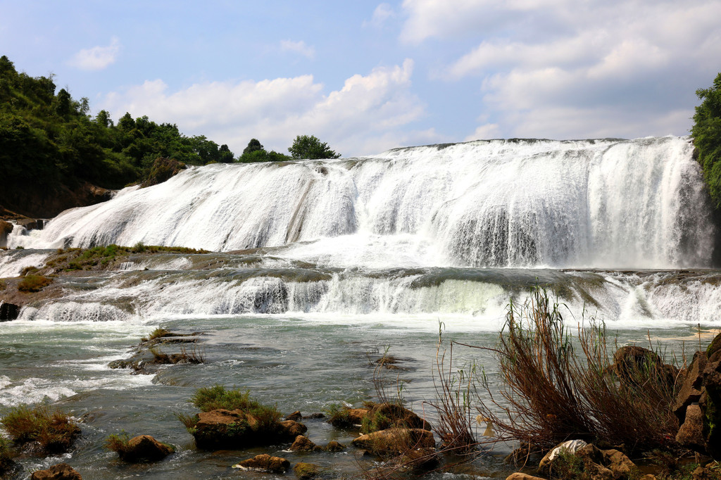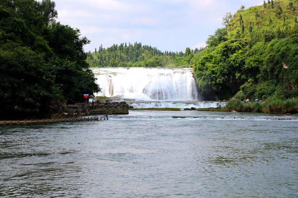 陡坡塘瀑布位于黄果树大瀑布上游1公里处(北门门口附近),我们沿着观光栈道一路往里走,宽阔平坦的溪滩上有许多大大小小的碧潭,深度从几十厘米到几米各不同。而在前方,我们远远地已能看见泻崖而下、翻空涌雪的陡坡塘瀑布,陡坡塘瀑布是黄果树瀑布群中瀑顶最宽的瀑布,瀑顶宽105米,高21米,瀑布顶上是一个面积达1.5万平方的巨大溶潭,瀑布则是形成在逶迤100多米长的钙化滩坝上。当我们走近陡坡塘瀑布,已闻水声轰轰,近看虽幅度宽而不显高,但汹涌澎湃,气势如虹,这陡坡塘瀑布也是西游记片尾曲中唐僧师徒四人牵马过河的取景地,不过这陡坡塘瀑布在整个黄果树瀑布群中只能算是个开胃菜,现在的黄果树景区内有20多个风韵各异的大小瀑布组成,被大世界吉尼斯总部评为世界上最大的瀑布群,列入世界吉尼斯记录,但大家其实都是冲着黄果树的核心“大瀑布”而来的。