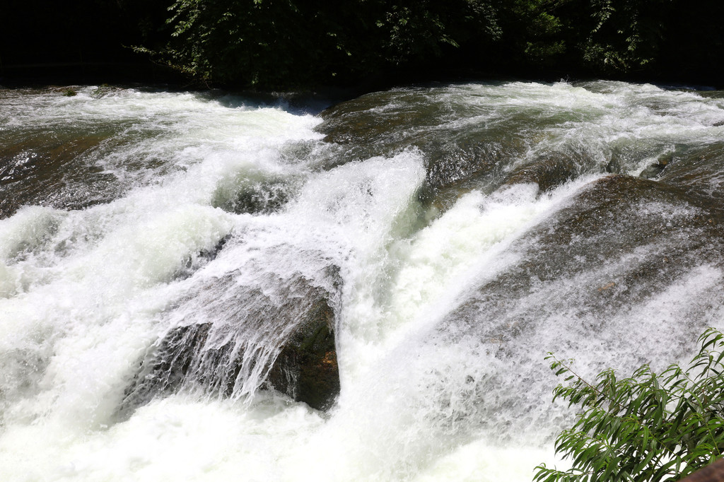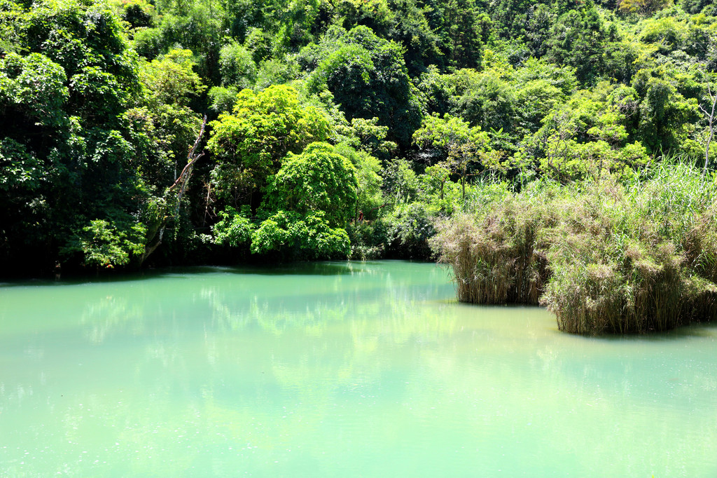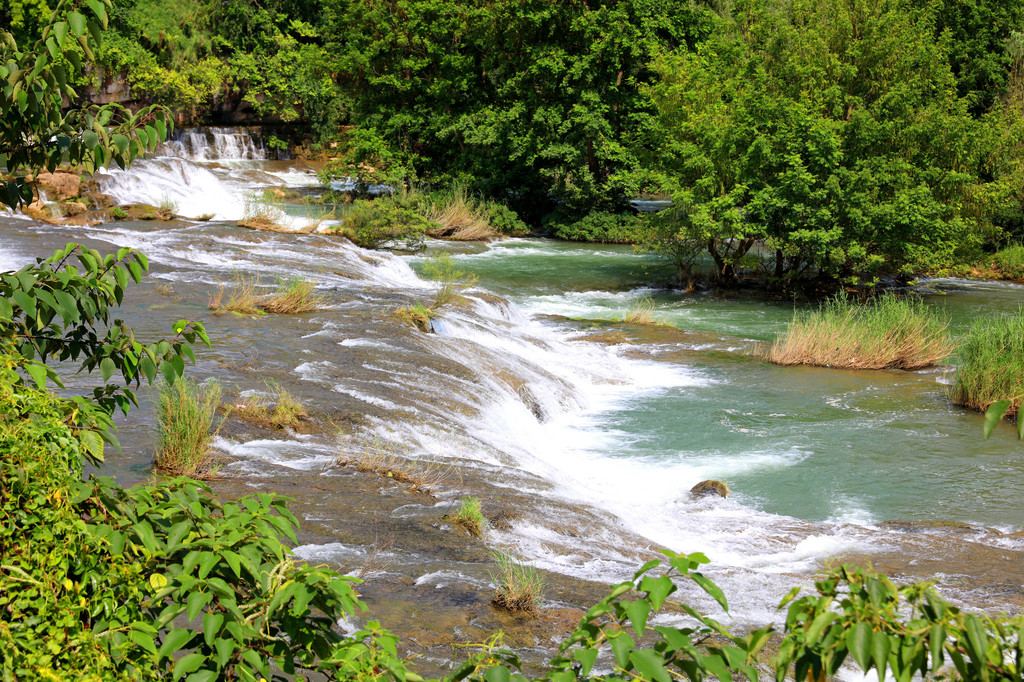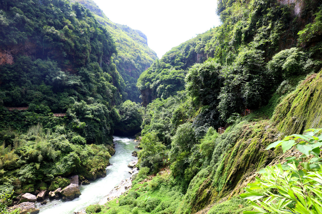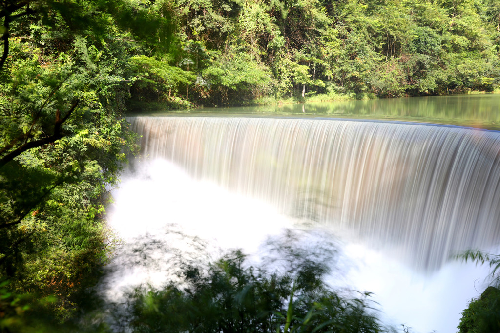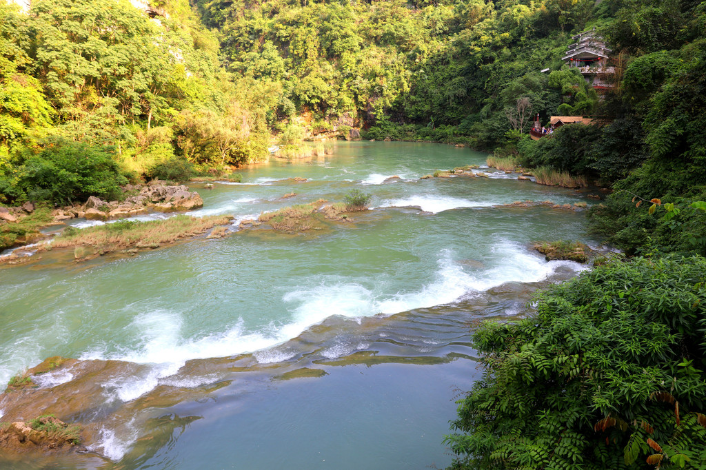 陡坡塘瀑布景区不大,逛一逛看一下一个小时差不多了,此时巳是下午将近四点,来之前看攻略上介绍天星桥景区面积很大,游览时间需四至五小时,现在去肯定已来不及了,而核心景区大瀑布游览时间大约一至二小时也够了,而且下午顺光,因此下午是拍摄大瀑布的最佳时间,我们决定接下去就去大瀑布景区,看攻略上有人介绍,从陡坡塘瀑布景区有一条路可自行走到大瀑布景区,我们决定尝试一下,沿着溪滩走出陡坡塘景区,慢慢溪滩汇成了一条河流,我们沿着河边慢慢向前,河岸这边的游人稀少,沿途景色宜人,虽然天气炎热,但林间空气清新。有道是:滔滔河水流淌,冲过层层堤坝;葱葱树木繁茂,绿遍重重峰峦。走到攻略上有介绍的霞客亭小歇,看到一景区工作人员,就问他我们从这走到大瀑布景区需多少时间,工作人员说最少也得四十分钟左右,建议我们还是去乘观光车前往,被他这么一说,又看时间己不早了,我们还是去乘观光车了。从陡坡塘景区门口应该是先乘车回景区北大门,然后再换乘前住大瀑布的车,因为今天游客多,我们碰巧乘到了从陡坡塘景区直达大瀑布景区的临时直达车,不过还是要先去天星桥景区后再去大瀑布景区,但这样还是不错,最起码我们不用下车换车了。