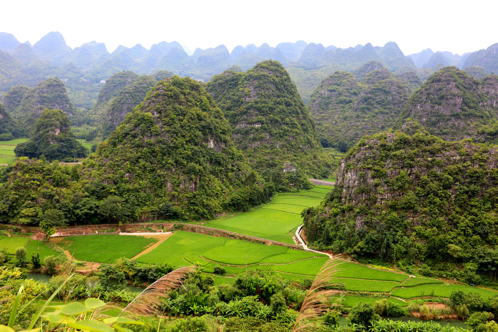 目前万峰林景区开放的其实只是西峰林,观光车载着我们沿着西峰林半山腰的观光道慢慢前行,7.5公里路程,中途会停靠8个观景台:将军峰、众星捧月、锦绣田园、八卦田、田园织锦、大顺峰、地眼、观峰台。让我们下车观赏拍照,站在观景台居高临下,只见万峰林山峰嵯峨,皆成柱状,如从田中破土而出的石笋。嶙峋的岩溶石,草木星缀其间;山势不高,却峰笋林立,比肩接踵,蔚为壮观,大大小小的山峰高低相连,层层相叠,直至消失在天的那一边,而山脚下,万亩良田如碧绿的地毯,舒展在峰林之间,黛瓦白墙的房舍散落于田野间,河流、人家、田园、山峰、古树…构成了一幅浓墨重彩的田园山水画卷。