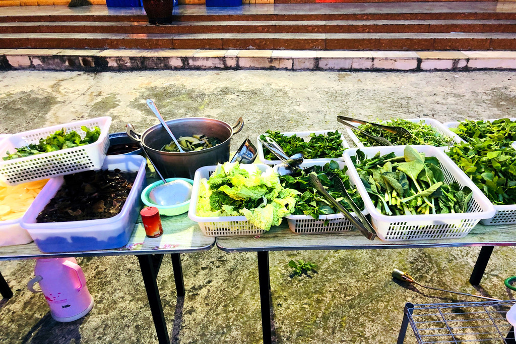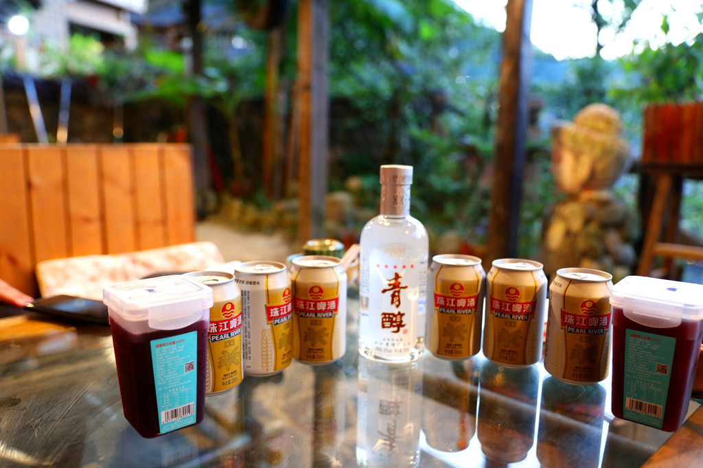 乡旮旯客栈不做餐饮,但可以叫外卖,老板推荐我们去不远处有一片大榕树下的下纳灰村中的餐厅去吃,晩上这里餐厅生意很好,等位的客人还不少,一看这情景,我们决定打包带回客栈去吃,坐在露台上,凉风习习,喝着小酒,看着眼前的峰林,感受晚霞和田野的蛙声,等待夜幕降临,此刻内心获得了久违的闲适,这才是我们想要的休闲度假生活。