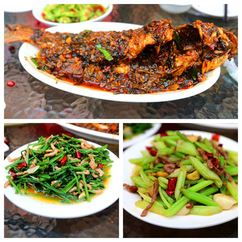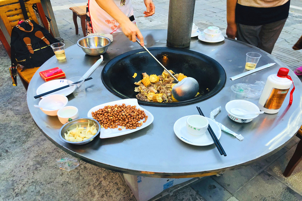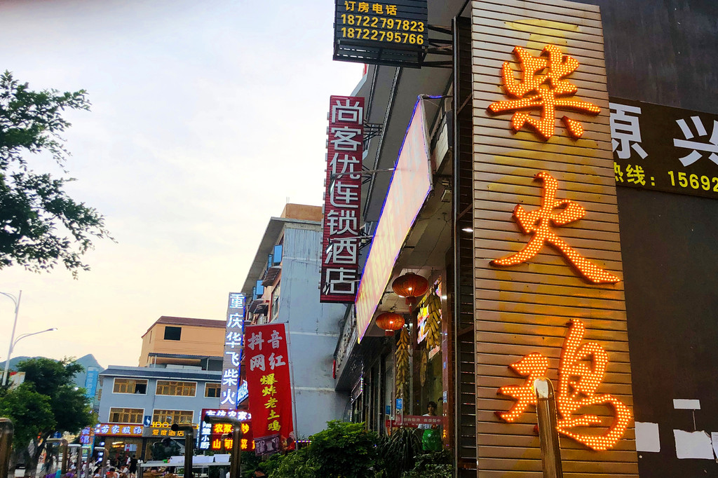 我们入住在黄果树景区美食住宿街,黄果树景区位于安顺的镇宁与关岭两县之间,我们入住的酒店地属关岭布依族苗族自治县,安排好入住已是晩上将近八点,赶紧出门找吃的,出酒店不远就是美食一条街,这条街其实是贵黄公路,来往的车辆多,餐厅也多,看到一家柴火鸡餐厅,顾客不少,我们也想尝尝新味道,就选这里了,现场选活鸡,现场活杀,然后在灶台里面生火,在锅里先炒再加汤煮,因为都是散养土鸡,肉质超级鲜美,还有很多新鲜的配菜,配菜免费,随意选取,有点像火锅,超级好吃。