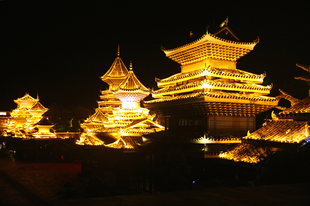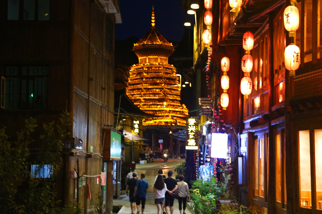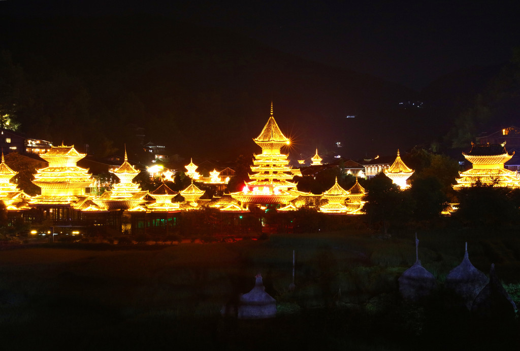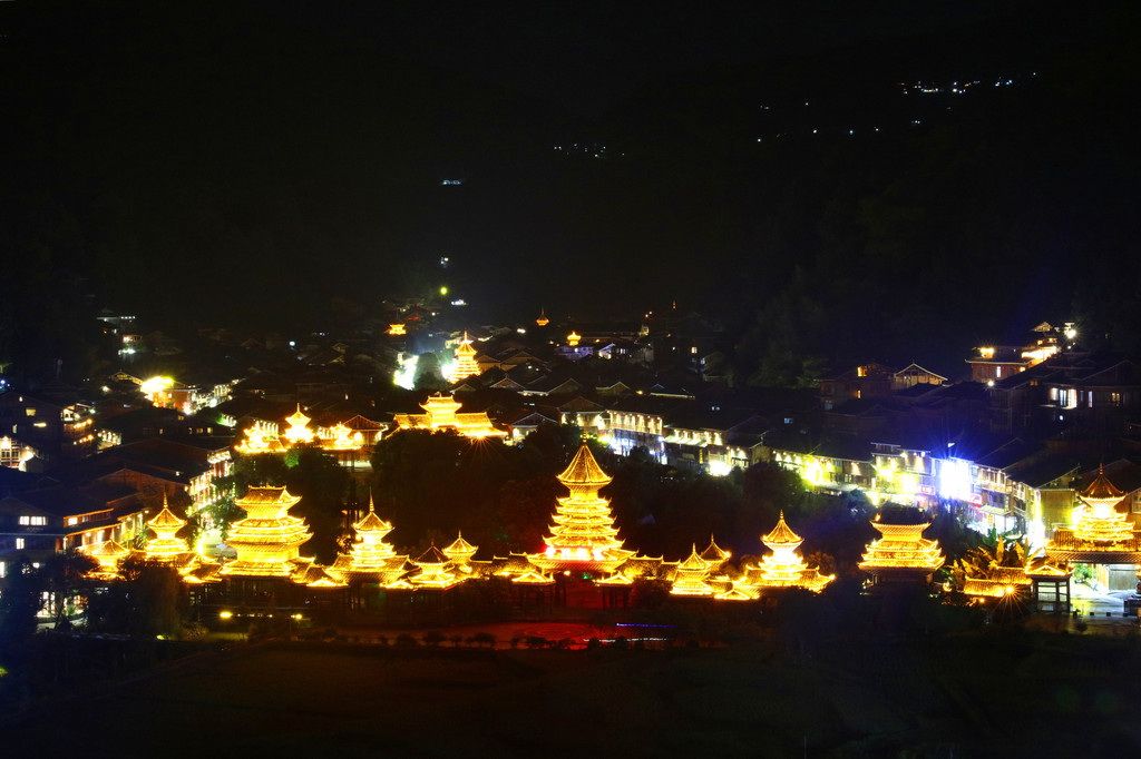 回到山下肇兴侗寨已华灯初上,漫步在肇兴侗寨古色古香的街道上会发现,古镇的每一个角落都被五彩的灯光精心装点着,头顶上皎洁的月亮倒映在河水中,和灯光互相交辉着,使得河面更加的亮了,柳树的身影也倒映在水中,轻轻地在水面上晃动着。流光溢彩、灯火辉煌的夜景描摹出侗寨一卷亮丽的风景线,侗族有三大宝:鼓楼、风雨桥和侗歌。每座鼓楼对应的着一座风雨桥和戏台,而当灯光开起来的时候,整鼓个楼显得都金碧辉煌,而且在水的倒影下会显得更加的有意境。夜色中的侗寨比白天人气旺了许多,游客、当地人围坐在街边,或纳凉聊天、或喝酒、吃饭,一付市井生活气息。我们在街边匆匆吃了点东西后赶紧回到入住的客栈附近,在寨门外小山坡上有个观景台,是一个俯瞰全寨的好地方,登上观景台,夜色下的侗寨,灯火璀璨,灯火点缀下的鼓楼、风雨桥犹如一条巨龙,蜿蜒在寨中。