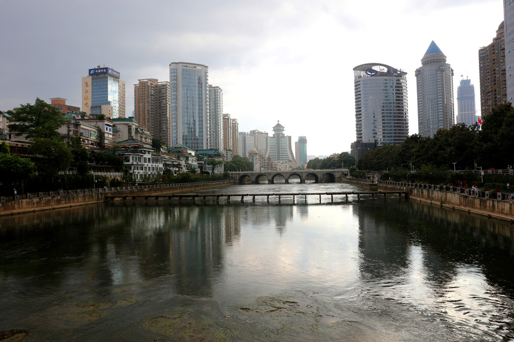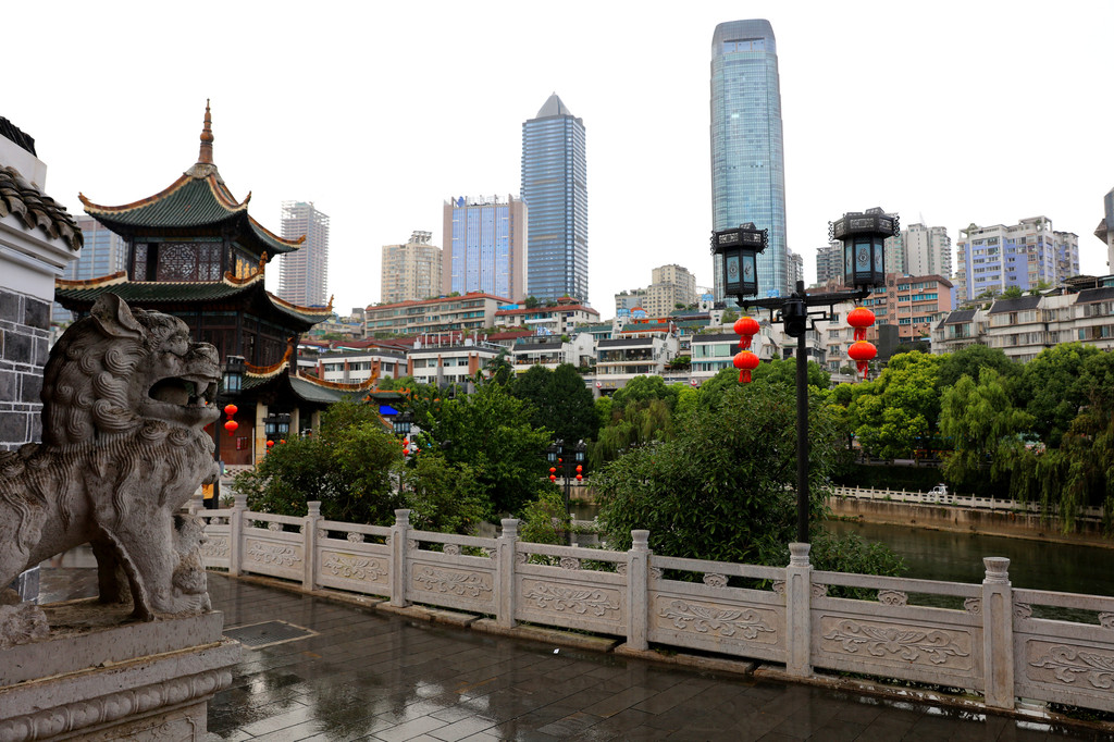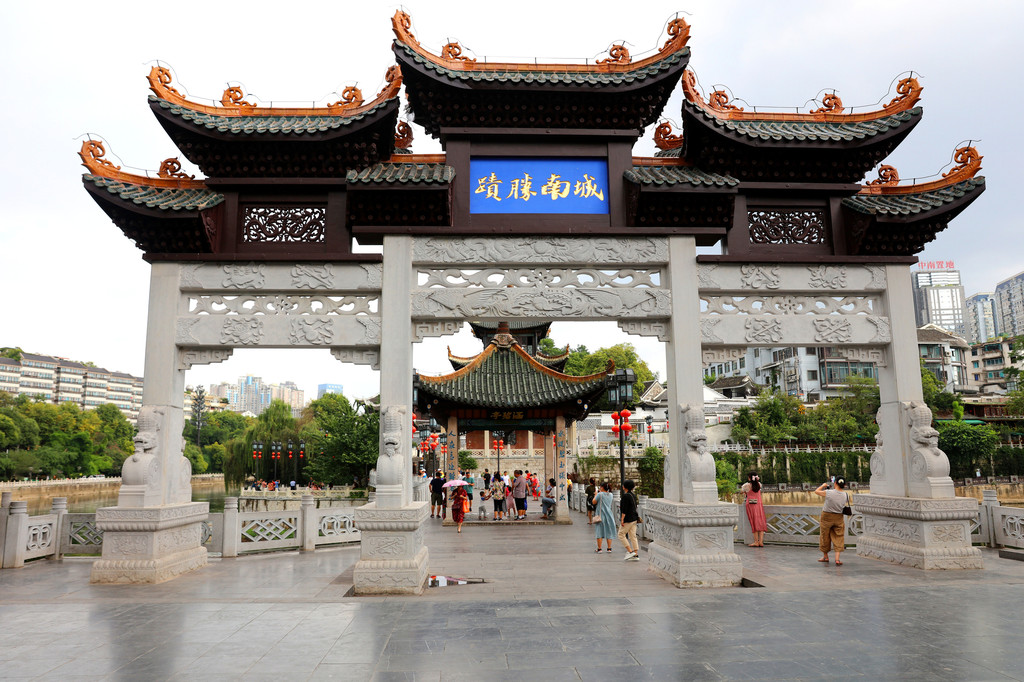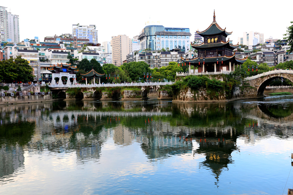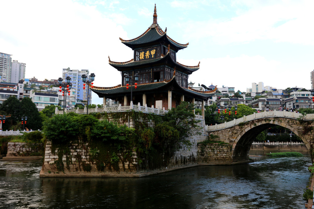 贵阳,山城交融,城在林中。山林城三者完美交融,使得这里的夏日十分地凉爽,有“23度空调省”、“爽爽贵阳”“之称,不过今年不知什么原因,贵州各地到处是高温天气,贵阳也是烈日炎炎,酷暑难耐,我们不得不在躲在宾馆里,避开正午最炎热的时间。等阳光稍弱一点了,我们决定先去甲秀楼看看,因为在我们的概念里,甲秀楼可以说是贵阳的标志,来贵阳除了看甲秀楼,其它好像再没啥地方了。沿着河滨步道悠哉向前走,南明河的水非常清浅,河底柔若无骨的水草随波舞动的景致别有风韵,走近甲秀楼景区,首先映入眼帘的是一座高大的石牌坊,上书“城南胜迹”四个大字,穿过牌坊,便上了浮玉桥,浮玉桥全长90余米,横于南明河上,贯通南北两岸。该桥原为九孔,称“九眼照沙洲”,后因临河修公路填埋二孔,现仅能见七孔,桥上有涵碧亭,桥下是涵碧潭、水月台,至河心“鳌矶石”,甲秀楼便是以此巨石为基而建。相传明万历年间贵州巡抚江东之于此筑堤联结南岸,并建一楼以培风水,名曰“甲秀”,取“科甲挺秀”之意,甲秀楼上下三层,白石为栏,层层收进,由桥面至楼顶高约二十米,虽只有二十米,但是在古代,那绝对算是当地的第一高楼了,甲秀楼经历了多次修葺,历经四百年的风雨,见证了贵阳的历史与发展。走过浮玉桥,便是翠微园,始建于明弘治年间,是一组较大规模的古建筑群,本想进园观赏一下,可是五点就闭园了,我们只能望园兴叹了。甲秀楼周边、南明河两岸,高楼林立,一片繁华,这几年贵州的发展超乎寻常,本想沿街逛逛,一阵乌云飘过,下起了阵雨,只得又回宾馆避雨了。