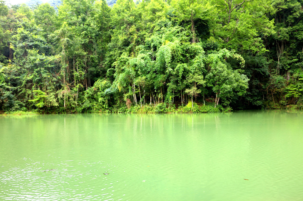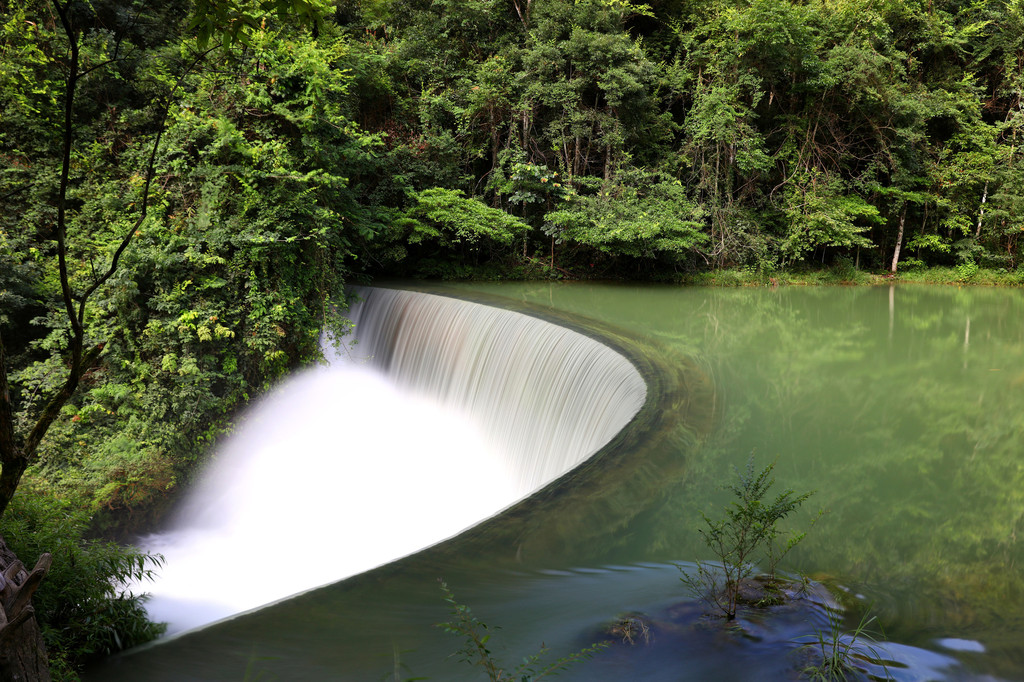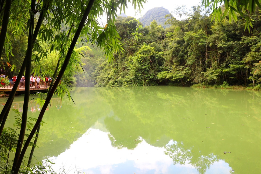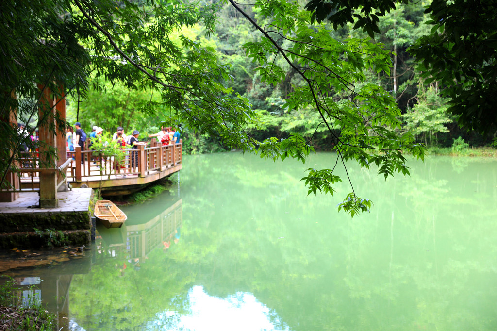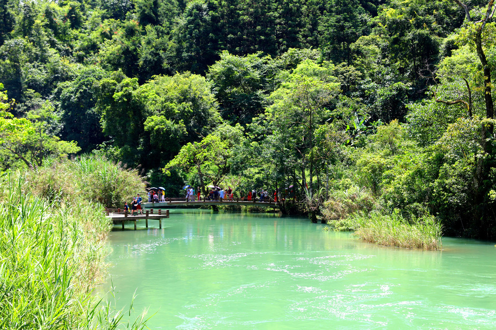 小七孔景区位于荔波县城西南的群山中,是一条宽仅1公里,但长达12公里的狭长谷地,我们乘坐直达西门的观光大巴,沿着谷地北侧的景区内环线盘山路,颠簸了近半小时来到卧龙潭下车,从这里开始了今天小七孔的游览,沿着木质栈道,一路可以走到卧龙潭,卧龙潭是喀斯特地貌暗河、小七孔景区另一条主要河道的卧龙河的出口处。潭水呈现一片祖母绿,类似九寨沟五彩池的蓝色,潭边奇石古木林立,潭面水雾迷蒙,宛若仙境,卧龙潭尽头有一人工拦水大坝名字响当当叫“卧龙坝”,潭底涌出的暗河水流,在水坝这里倾泻而下,形成“卧龙瀑布”,剧烈的动静反差才让人意识到卧龙潭底存在着不断涌动的暗河水,但卧龙瀑布上游的潭水却没有丝毫的波澜,瀑布的两端一静一动,人为地营造了静与动、阴与阳的两个世界,传闻即使水位高涨洪水倾泻,卧龙潭也犹如深渊,潭面如镜,站在人头涌动的卧龙潭瀑布前看从水从水坝落下,整齐划一的细流看上去很纤细秀美,靠近却是雨雾蒙蒙水声轰鸣。