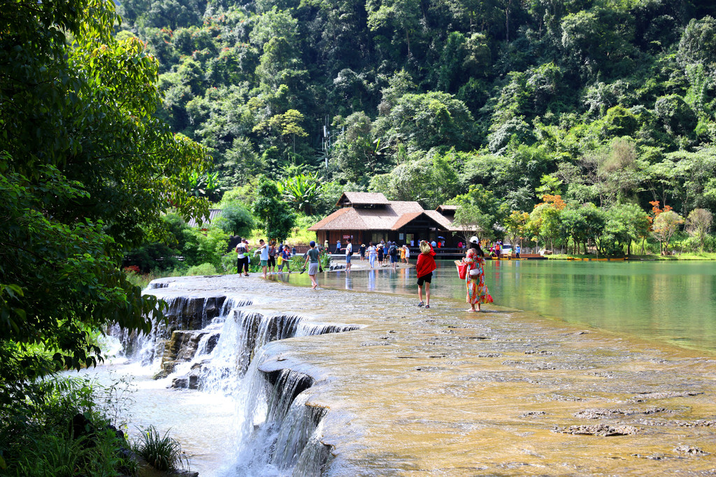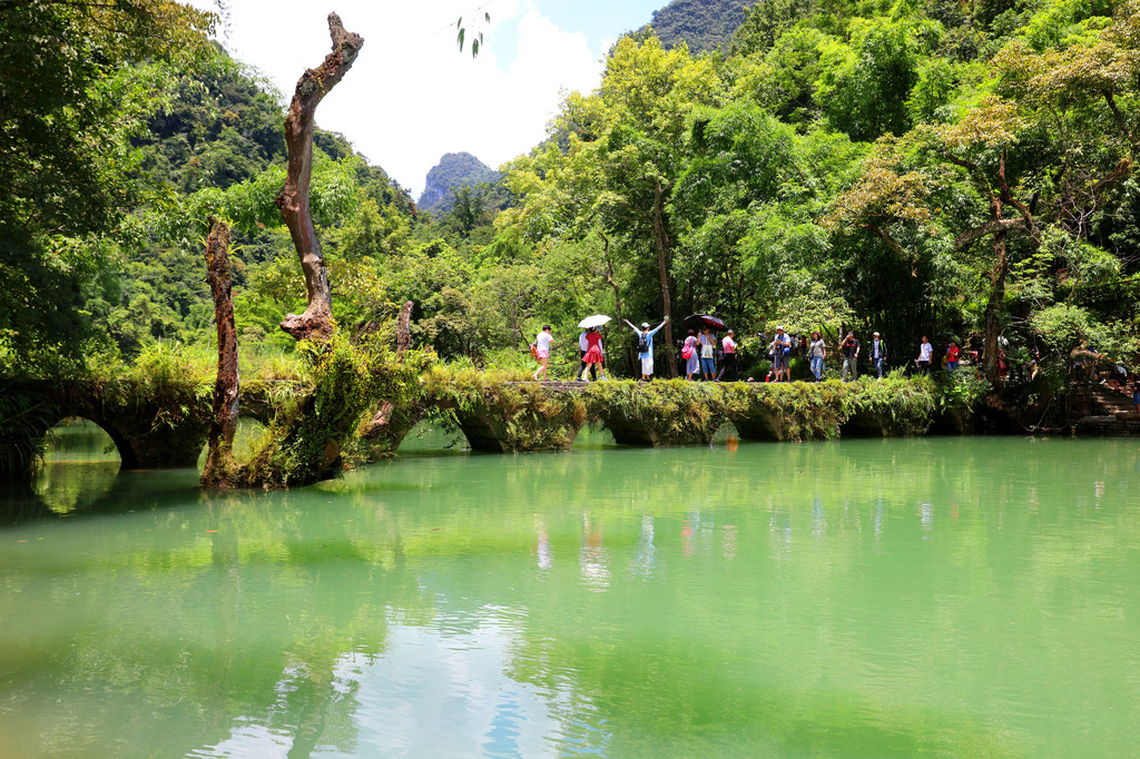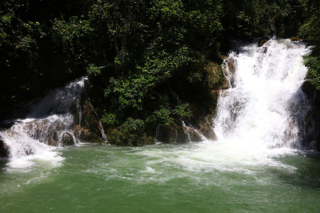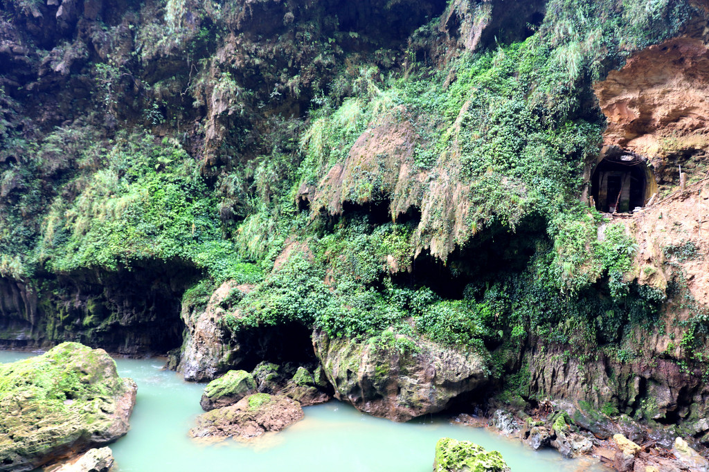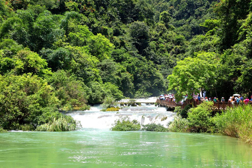 小七孔景区位于荔波县城西南的群山中,是一条宽仅1公里,但长达12公里的狭长谷地,我们乘坐直达西门的观光大巴,沿着谷地北侧的景区内环线盘山路,颠簸了近半小时来到卧龙潭下车,从这里开始了今天小七孔的游览,沿着木质栈道,一路可以走到卧龙潭,卧龙潭是喀斯特地貌暗河、小七孔景区另一条主要河道的卧龙河的出口处。潭水呈现一片祖母绿,类似九寨沟五彩池的蓝色,潭边奇石古木林立,潭面水雾迷蒙,宛若仙境,卧龙潭尽头有一人工拦水大坝名字响当当叫“卧龙坝”,潭底涌出的暗河水流,在水坝这里倾泻而下,形成“卧龙瀑布”,剧烈的动静反差才让人意识到卧龙潭底存在着不断涌动的暗河水,但卧龙瀑布上游的潭水却没有丝毫的波澜,瀑布的两端一静一动,人为地营造了静与动、阴与阳的两个世界,传闻即使水位高涨洪水倾泻,卧龙潭也犹如深渊,潭面如镜,站在人头涌动的卧龙潭瀑布前看从水从水坝落下,整齐划一的细流看上去很纤细秀美,靠近却是雨雾蒙蒙水声轰鸣。