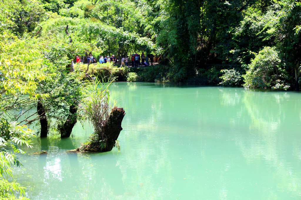 小七孔景区也是一个人气很旺的景点,一大早八方游客纷至沓来,到处人头攒动, 但据我们住的客栈老板介绍:贵阳出发的旅游团都从西门进,一般中午才到, 而荔波县城出发的团和住景区附近的游客一般都从东门进,半个小时就能到景区。也就是说,早上东门人比较多,早上进景区的话,为避开人流高峰,建议直接从东门乘景区游览车至西门卧龙潭,而且整个景区是西高东低,从西门卧龙潭一路向东往下走会省力不少。