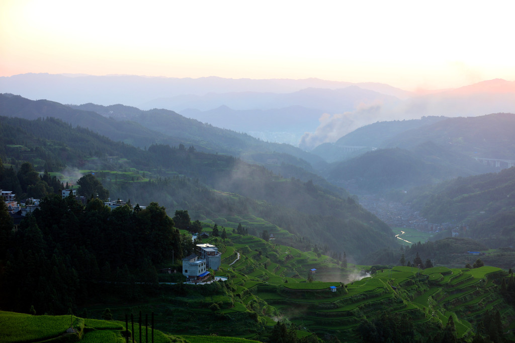 因为昨天客栈老板娘介绍寨门外的观景台是拍摄日出最佳处, 清晨我又一次来到昨晚拍摄夜景的观景台, 据高临下,肇兴侗寨前边旖旎的小片田园、耸立着的5座鼓楼、以及层次分明的传统民居、整座侗寨都在这里一览无余,而此时,观景台上聚集了不少摄影爱好者,大家都架好三脚架等待着朝霞升起.........炊烟袅袅中的肇兴侗寨四面环山,寨子建于山中盆地,两条小溪汇成一条小河穿寨而过,寨中房屋为干栏式吊脚楼,鳞次栉比,错落有致,全部用杉木建造,硬山顶覆小青瓦,古朴实用,远处山间的盆地上云遮雾绕,轻盈的薄雾穿过层层叠叠的吊脚楼,飘向远山,直上云霄,寨子若隐若现,犹如一幅浓墨重彩的山水画。可惜今天的天公不作美,在观景台上等待了许久,笼罩在天空的薄雾久久不散,期待中的朝霞迟迟没来,大家在失望中纷纷离开观景台。