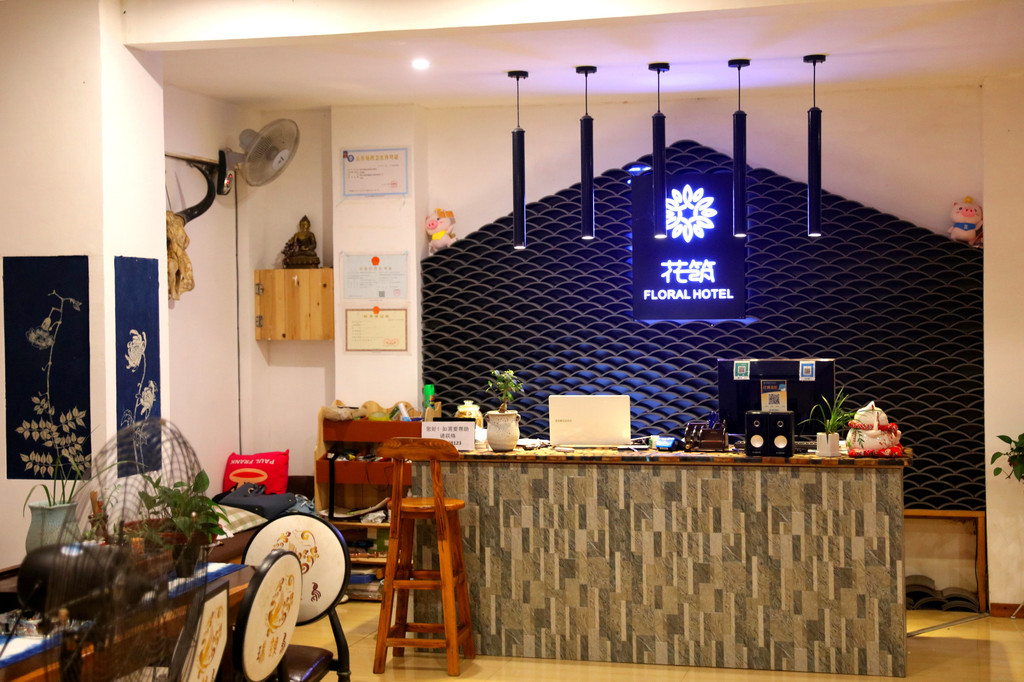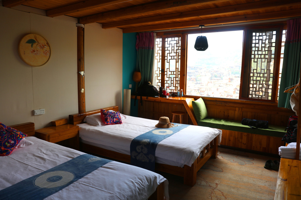7月28日我们入住的是花筑·西江苗寨陌上花开客栈,去西江苗寨前看攻略上说订到一家好的客栈民宿那就来对了苗寨的一半,因为看苗寨全景及苗寨的万家灯火是来西江苗寨的一项重要选项,而且一定要选一高处才能看得全面,而观景台是观整个西江苗寨的最佳处,一开始准备预订西江苗寨住宿时被苗寨内众多的宾馆、客栈、民宿看的眼花撩乱、无从下手,因为知道花筑是由携程战略投资,已成为国内民宿酒店领军品牌,花筑品牌的客栈整体还是很不错的,虽然价格稍高一些,肯定比一些杂牌客栈强很多,在确定我们的行程后,并看了游记攻略点评后,出行前第一个预订的就是花筑·西江苗寨陌上花开客栈。陌上花开真是一个可爱的去处,当我们乘坐西门景区观光车进去后根据客栈管家事先提示在望月客栈路口下车后,即看到陌上花开客栈路牌,致电客栈, 客栈管家是一个可爱帅气的苗家小哥,马上下来帮忙提大件行李, 客栈位置虽然比较高,要爬一小会儿路,但它有绝佳观景位置,在屋里就可以欣赏无敌夜景,比起寨子里的公共观景台也毫不逊色,客栈同时配有公共书吧和观景台,真是清新舒适的一次体验,因为疫情的关系,我们入住的时候整个西江苗寨陌上花开客栈就一个管家小哥,但他为人热情贴心勤快,我们离店时又帮我们拿行李送我们下山,因此花筑·西江苗寨陌上花开客栈是我们此次整个贵州行程中价格最贵的一次住宿、但也是客房体验舒适、景观最佳的一家客栈,属物有所值。所以在订西江苗寨酒店的时候我会建议,如果从西门进,不用犹豫了就订山上的酒店,最好是订像陌上花开客栈能直接观景的这种。