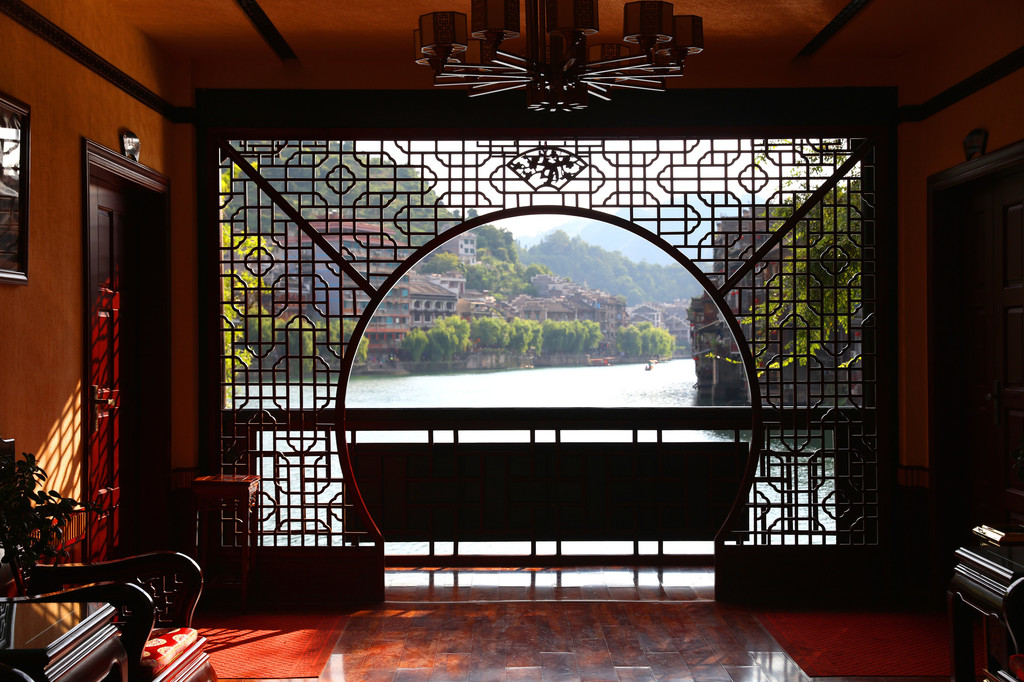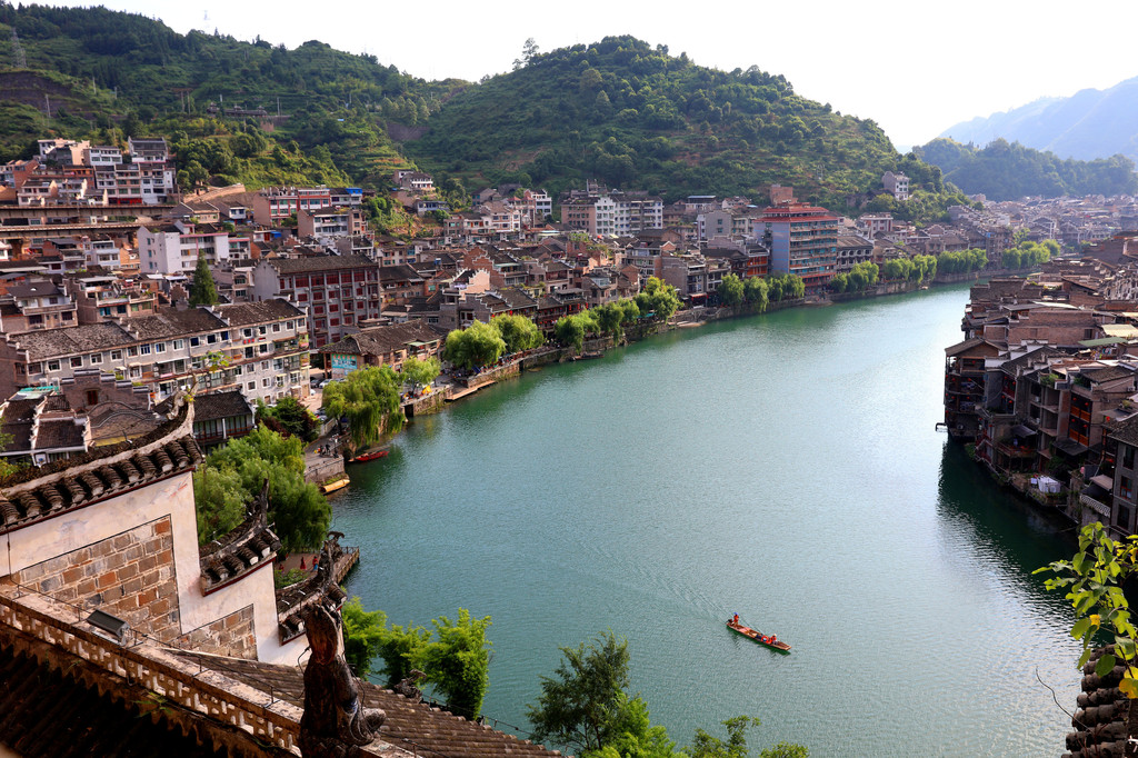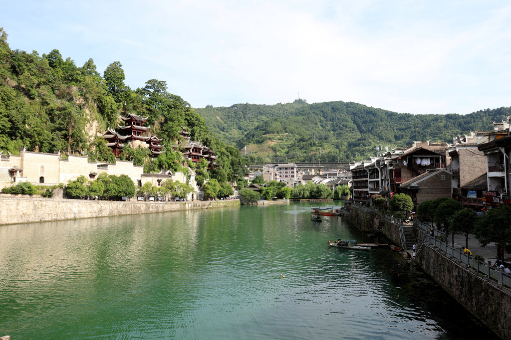 从肇兴侗寨开车三个多小时,我们来到了黔地著名的镇远古城。镇远曾经是通往贵州、云南、广西等地的交通要道。因城内舞阳河自西向东穿城而过,水路交通发达,因此建造了十几座码头,作为货运集散地而迅速繁荣起来,素有"滇楚锁钥、黔东门户"之称,现在的城池建于明朝,是一座名副其实的古城,舞阳河北岸为旧府城,南岸为旧卫城,整个古镇以舞阳河为轴心源头,古城内的主要景点分布舞阳河两岸,也实属舞阳河畔风景独好,因为白天镇远古城舞阳河北岸的街道社会车辆禁行,而我们预订的客栈在北岸,客栈老板事先已指导我们把车停放在南岸的林业局停车场,然后派人来接我们,今年贵州气候反常,原来的避暑地,到处是热浪滚滚,而镇远可能是因为地理位置的原因,是我们来到贵州后感觉气温最高的地方,步行了十多分钟,跨过舞阳河上的古桥祝圣桥,烈日炎炎下我们已是满头大汗,我们所订的山水谈客栈,就在石屏山山脚下、临河的一排建筑中,入住的江景阳台房,阳台栏外看出去便是祝圣桥,而河对岸就是青龙洞,外面赤日炎炎,又开了三个多小时的车,又热又累,我们决定先待在房间里休息,避开午后灼热的阳光,坐在阳台上,喝着茶,吹着习习江风,碧绿的舞阳河水在古城中轻声流淌,古城人的小船在河上悠悠飘荡,此时阳台外展现给我们的是一个传统而静谧的镇远,面对如此景色,暑意和疲惫一扫而光。