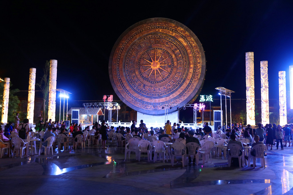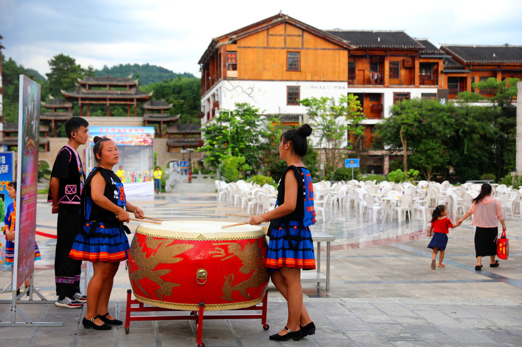 得益于贵州这几年高速公路、桥梁超想像力的建设发展,天堑变通途,五个多小时后,我们驶过了起伏连绵群山间的四百多公里高速公路,来到已地属黔南与广西交界处的荔波小七孔风景区附近的荔波梦柳布依风情小镇,小镇位于荔波县瑶山瑶族乡,紧邻大小七孔景区东门,是以移民搬迁结合旅游创建的村镇,依托荔波大小七孔优质旅游资源,按照AAA级景区规划布局所新建的一座颇具民族文化特色的风情小镇。今晩我们就入住在这里,小镇已初具规模,一踏入小镇,浓浓的民族风情扑面而来,广场中央浑厚巨大的铜鼓,给人以极强的视觉冲击,铜鼓广场上聚集了来自各地的游客,人们在此休闲纳凉、品茶聊天,观看屏幕上的歌舞,有人在麦克风前放声欢歌,此刻的小镇一派欢乐祥和。