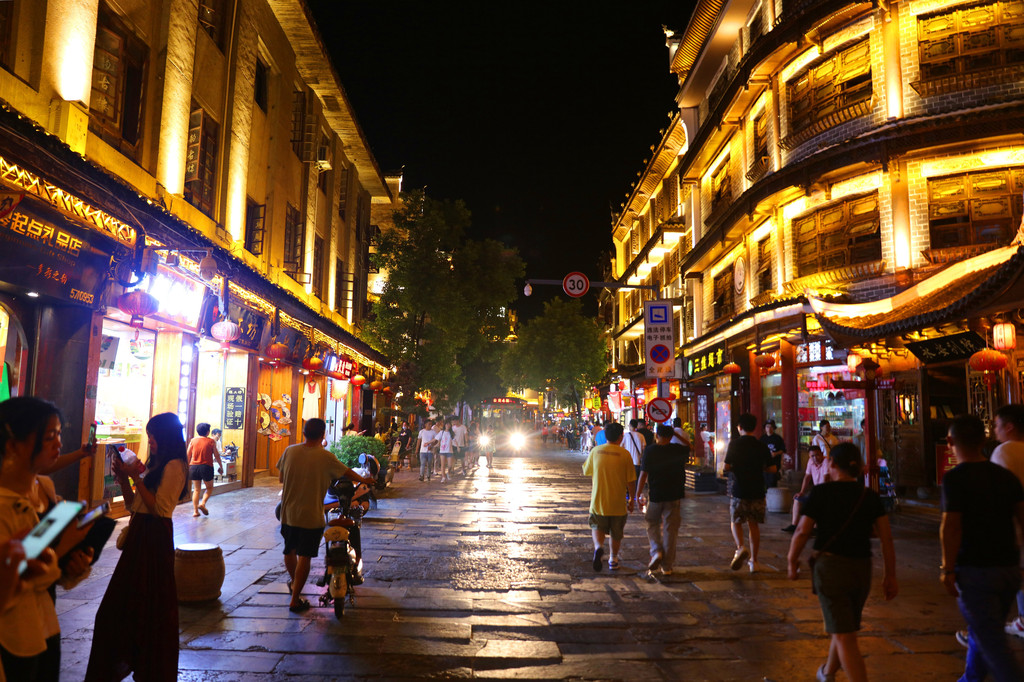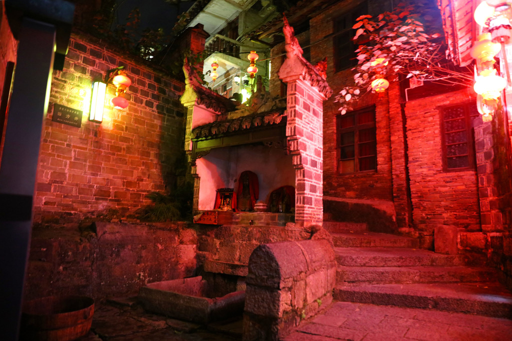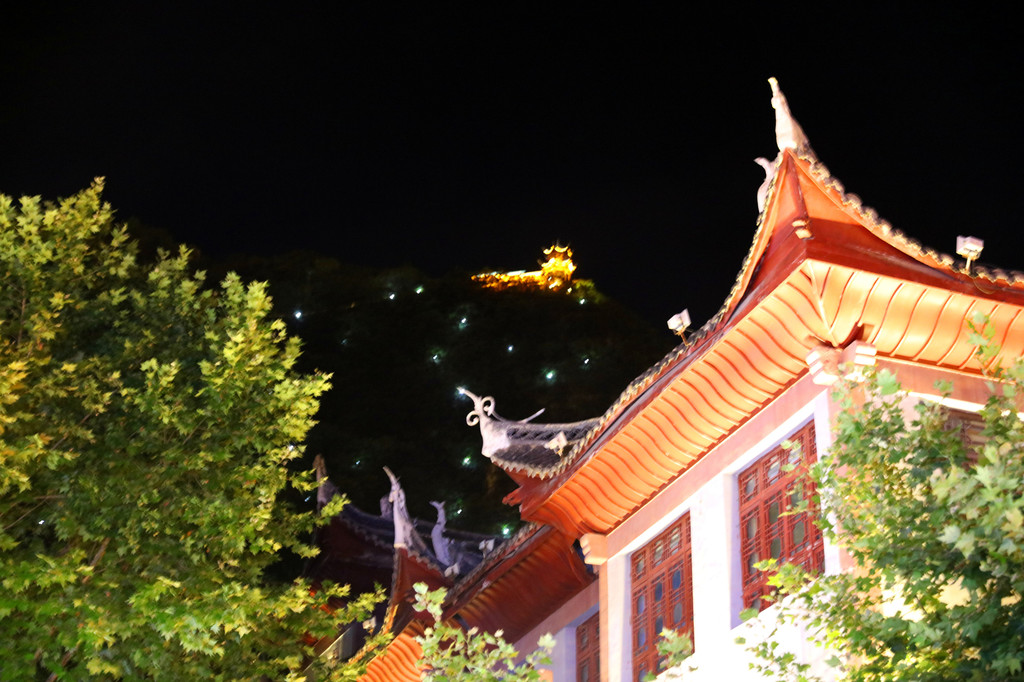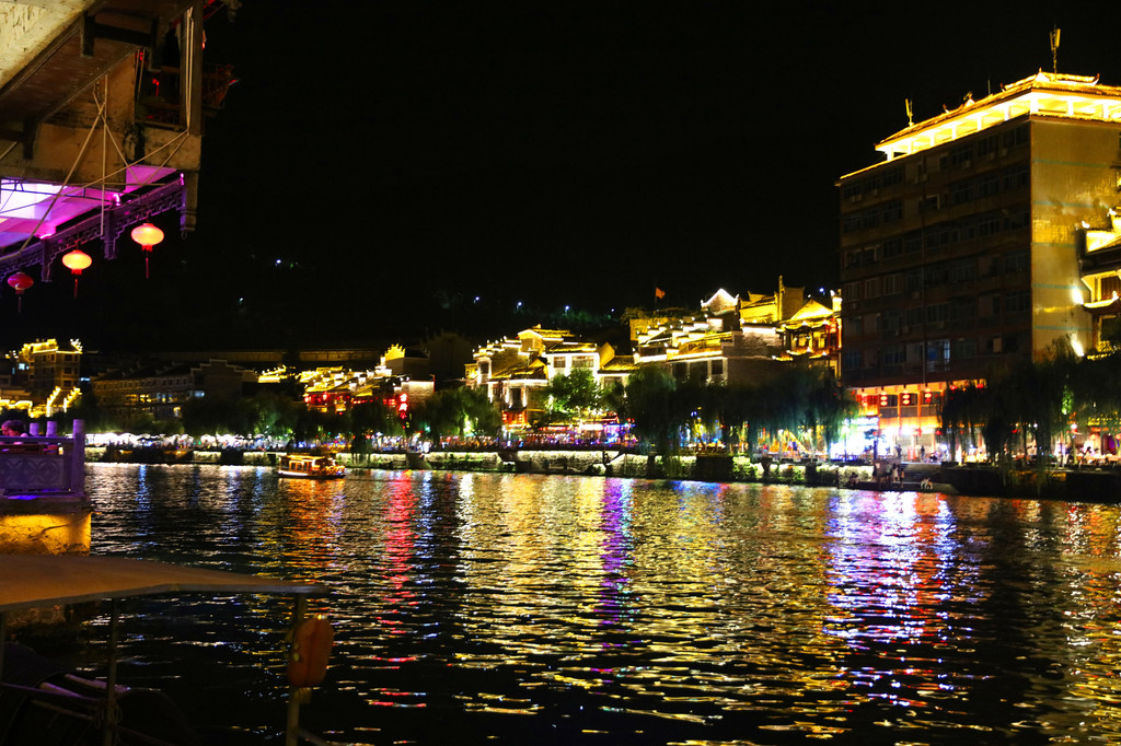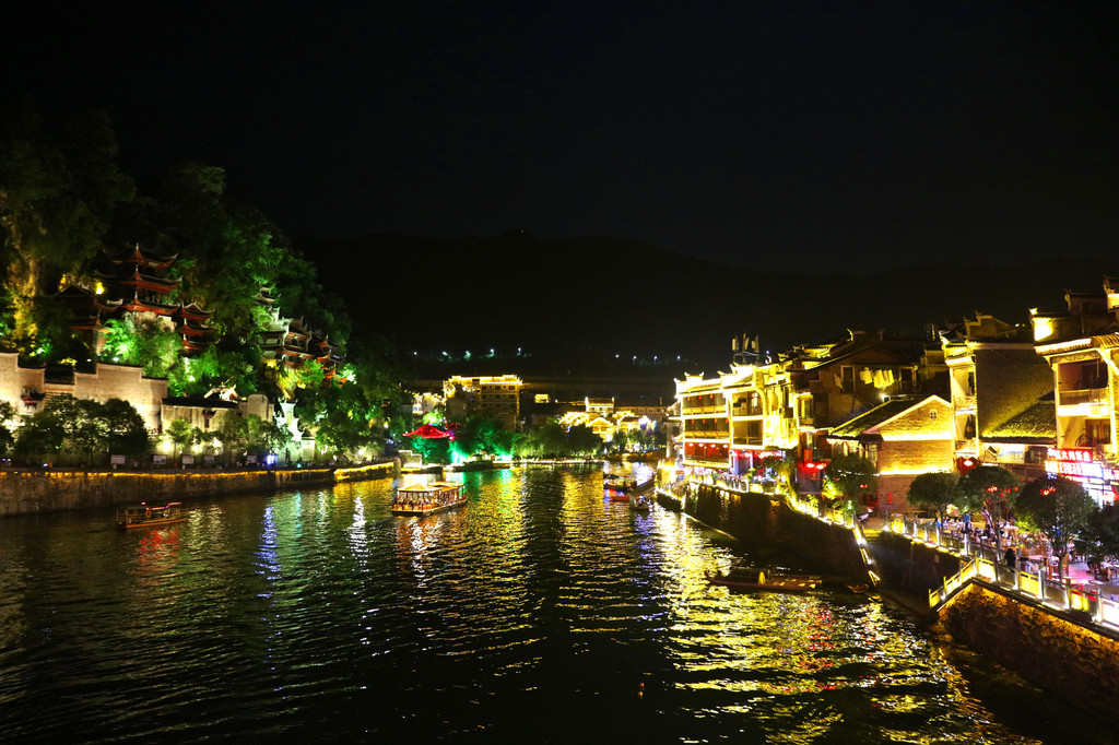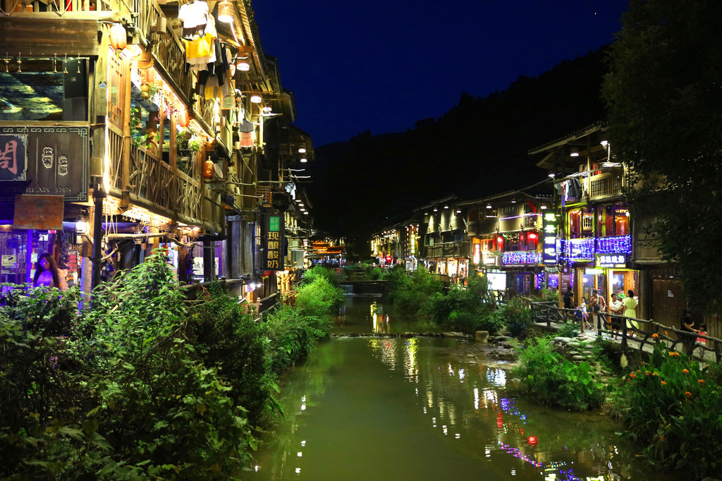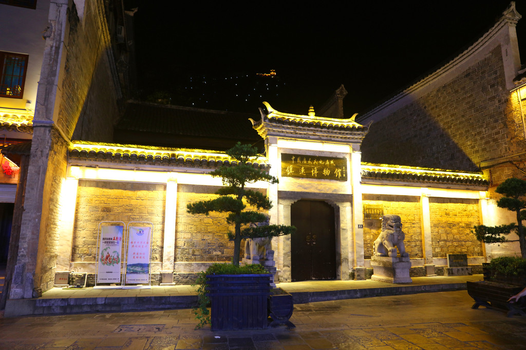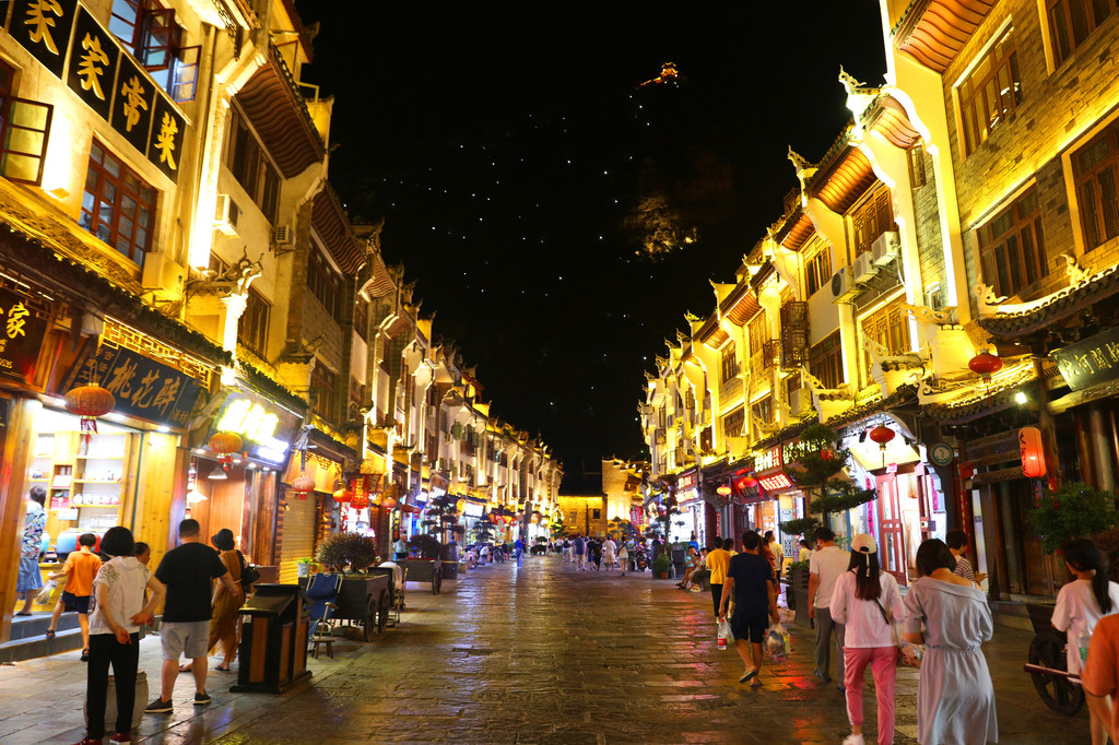 在古城内逛了一段,肚子饿了,正好看见一家网红餐馆赶紧进店解决晚餐。吃过晩饭走出餐馆,天色已黑,沿街的灯笼都亮了,整座古镇又是另一番景色,这儿没有其他古城的那种商业与嘈杂,空气中弥漫的是最日常的烟火气,而我们此刻想登上镇远古城内的石屏山看古城夜景,石屏山下有许多保存完好的古巷,古巷内集中了好多古民居从西至东有冲子口巷、仁寿巷、复兴巷和四方井巷等。走到四方井巷门有一块石屏巨镇的牌坊,旁边有指示牌指向石屏山。沿着青石板小道,走入四方井巷,古民居和巷道在红灯笼的映衬下,很有穿越到明清时代的感觉,进入小巷不远就看到一口古井,这口井便是四方井巷名字的由来了,里面的井水来自于石屏山上的山泉,冬暖夏凉,井中至今仍旧养鱼,说明还在使用中,继续往小巷深处走,古巷错综复杂,曲径通幽,我们很快被这层层叠叠错落的石板路迷惑,好在小巷深处有不少纳凉的当地居民,在他们的指导下我们终于来到了石屏山的半山腰,看山下,夜幕四垂后的镇远,像是化身成一座不夜城,舞阳河两岸餐馆和酒吧林立,“九山抱一水,一水分两城”,舞阳河将整个古镇分为两岸,北岸旧府城,南岸旧卫城,俯瞰很像太极八卦图,历史的沉淀让这座小城有着独有的魅力,历经多年风雨,依旧风姿依旧,再一看石屛山顶灯火通明的观景亭,还需要爬很长的台阶,喝了点小酒、今天又奔波了一天的我们决定打退堂鼓了,从四方井巷回到兴隆街上,往祝圣桥方向走,昏黄的灯光和古建的飞檐翘角非常相配,夜晚的石屏山不打光,但是山壁上有很多一闪一闪的小灯,像是漫天繁星,很是浪漫,回到祝圣桥附近,两岸的灯火通明、河中往返游过的观光船、桥上如织的人流,不得不感慨,在这镇远古城能感受时间赋予的厚重感的同时又是一个充满活力之城。