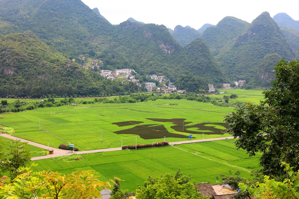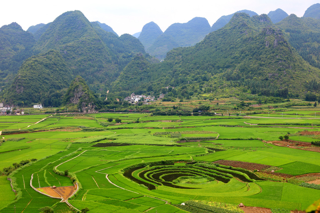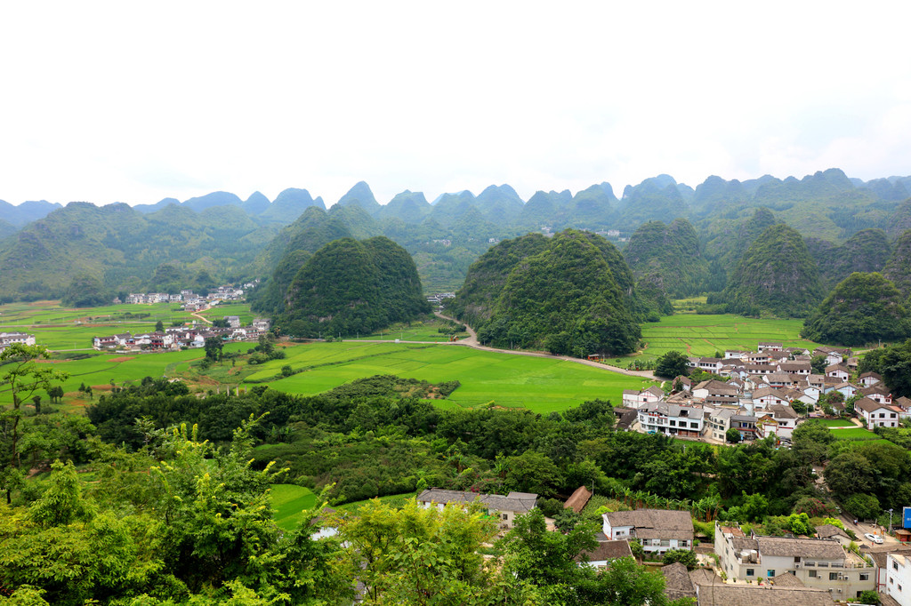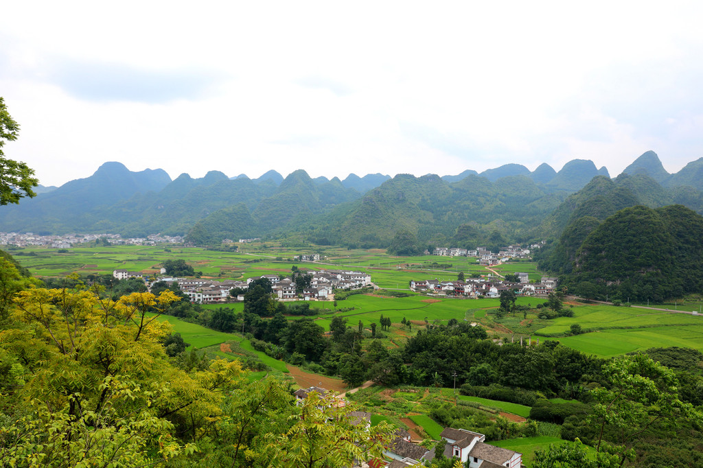 山峰秀丽,屋舍俨然,稻谷青翠,田园风光如画一般的万峰林最佳游览时间应该是毎年2、3月份或9、10月份来(那时整个景区的油菜花盛开或稻谷成熟丰收季,万峰林沉浸在一片金黄之中),我们虽然不是在最佳时间来到万峰林,但仍叹服大自然的造物能力,这种农田与峰林的完美组合的独特美景有种“车在画中游,人在画中走”的感觉。