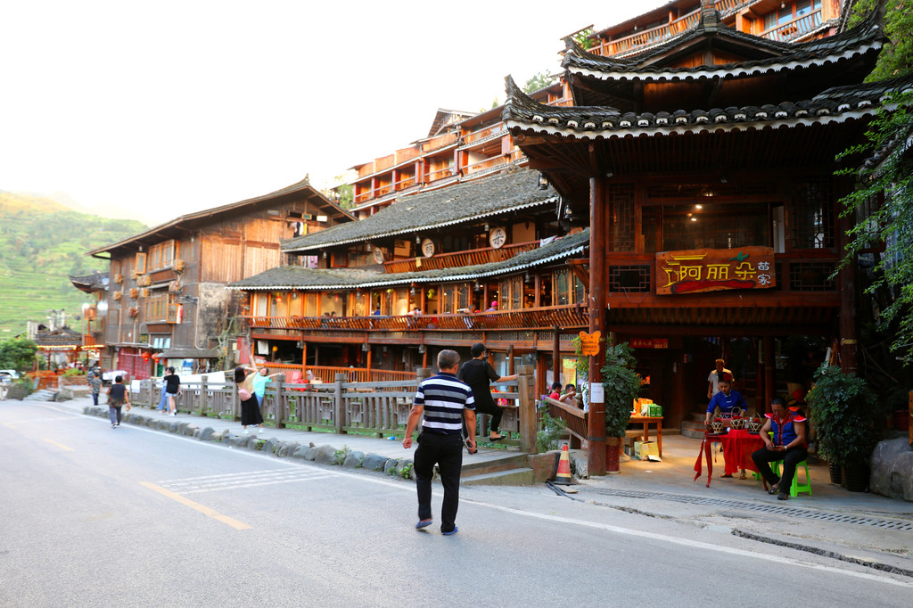 在黔东南,苗寨与侗寨终归是绕不过去的,对于侗族,最具代表性的当属每个村寨的鼓楼了吧。而肇兴侗寨可不光只有鼓楼,肇兴侗寨曾被评选为“中国最美的六大乡村古镇”之一,特别是在西方的游客心目中,中国西南地区少数民族地区有两处独特的民族文化和特征异常凸显的旅游资源,那就是云南丽江地区和贵州凯里地区的少数民族风情。当发现神奇的肇兴侗族风情可与丽江媲美时,欧美客人特别喜欢这里,被誉为“世界上最大的民族博物馆”,“人类疲惫心灵的最后家园”“,人类保存的最古老的歌谣”,联合国世界文化基金会确定为全球“返璞归真,回归自然”十大旅游首选地之一,世界乡土文化保护基金会授予的全球18个生态文化保护圈之一(亚洲有两个,除了黔东南另一个是中国西藏)。国人眼里一直是小众的肇兴侗寨可能是因为深藏在贵州与广西交界的大山中,以前交通不便,而如今交通状况大改善,高速公路和高铁极大地拉近了黎平侗寨与外界的时空距离,我们从西江千户苗寨开行三个多小时后来到肇兴侗寨,这里和西江千户苗寨一样,自驾车不能入内,需在景区大门换乘景区观光车才能达到寨门。寨门外是一片碧绿的稻田,古朴神秘的边寨风光与青山秀谷融为一体,浑然是一幅世外仙居图,我们同样也选择了花筑品牌的客栈,就入住在位于寨门不远的中心广场旁的那年花开精品酒店,在酒店办好入住后,明显感觉这里好冷清,似乎没有什么人,和西江千户苗寨相比,虽同属黔东南州,这里更原生态一些。在客房内稍作休息后本想在客栈门口中心广场转转,热情的客栈老板娘向我们介绍肇兴侗寨游玩的路线,特别推荐了堂安侗寨,这个可是我们没做过攻略的地方,据说堂安梯田徒步线是“中国七大最美徒步线路之一”,也是看梯田和落日的好地方,当然现在徒步去时间上已不够,但可乘公共巴士前往,最晩一班是下午六点,一看此时已是下午五点三十分,时间上还赶的上,客栈就有车票购买,来回二十元,我们赶紧买好车票带上照相机匆匆前往乘车点。乘车点在上寨(东寨门)停车场,而我们入住的客栈位于(西寨门),走到上寨停车场约为20分钟。沿着寨中的主街匆匆而过,终于赶上了公共车。