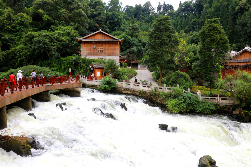 观赏完卧龙潭,前方不远处有观光车站,在这里可以前往鸳鸯湖和天钟洞,鸳鸯湖是以娱乐见长,主要可以自行划船游览密林镶嵌、林溪穿插的水上森林,但会多花不少时间,而天钟洞则是观赏钙化钟乳石的溶洞,而来小七孔主要是来看水的,为节省时间我们决定舍弃这二处,直接至下一站翠谷湿地,翠谷湿地和翠谷瀑布是联在一起的,一条亲水栈道把这里分成两边,左边是上定己湖,右边是翠谷湿地。 沿着栈道往前走,一路流水潺潺,开阔处山映水平,犹如一幅桂林山水图,来到响水河最上游的翠谷瀑布,因其身处苍翠群山间的谷地而得翠谷之名,小七孔内瀑布众多密集,翠谷瀑布是落差最大的一个,有六十多米高,但远观却温婉如玉,状似玉带挂在郁郁葱葱的山间,近探水顺山势倾泻而下,浪花飞溅,水雾蒙蒙,犹如群龙下山,清新悦目。游过了瀑布再往前走,来到翠谷车站,从这里可乘车前往水上森林,在这基本上就是在沿着小溪徒步一两公里,由于树林茂密,所以难度不大,也不太费力,水上森林被称为是小七孔的瑶池,它是比较少见的岩溶地貌,600多米的路程,分为上下两段,不过这一段特色不鲜明,再向前乘车可至石上森林,一想还是节省体力、时间,观水为主,我们没去石上森林,而是走向断桥飞瀑, 断桥飞瀑是一股水流从山上的一凸出处向下喷涌出来的,坠落在响水河中,行人从瀑布下方穿过,很有趣味。不过怎么看水流像是从一根断开了的水管中喷涌而出,不知这个景点是自然形成的,还是人工制造的。 过了断桥飞瀑继续往前行,就到了双龙瀑布,再往前走就是68级跌水瀑布了,这里的河床高低起伏形成的瀑布跌水众多而密集,层层叠叠的瀑布,淙淙哗哗倾泻而下,这种地质和景观哪怕是在全国也是不多见的。高低差的不同、河床形状、河流宽度的不同,使得形成的跌水或是涓涓细流、或是声如洪钟、或如匹练飘逸,或似珍珠落玉,形态万千,目不暇接。这一段也是整个小七孔景区游客最密集的地方,再往前走不远就能听到前方吼声如雷般的水声,那便是拉雅瀑布了,拉雅瀑布有10米宽,落差则达到30米,仿佛从天而降,势如山倒,腾空喷泻,横向坠落的拉雅瀑布同响水河纵向错落的68级瀑布构成一幅绝妙的立体交叉瀑布群景观。瀑在路侧,人在瀑下,铺天盖地般四溅的水珠将栈道上的人们笼罩在水雾中,在湿热的夏日带来一丝清凉。再向前就是小七孔景区游览的终点小七孔古桥,小七孔景区名字的由来,正是因为这座玲珑的七孔石桥,石桥桥长25米,桥面有4米宽。这座建于清朝道光年间的石桥,属于茶马古道,因此当地的茶叶也非常有名。古桥当时是通黔桂的商旅之路,这头是贵州,那头是广西。此刻呈现在我们眼前的是爬满藤蔓和蕨类的古朴石桥,有湛蓝的湖水,宁静、没有一点点的涟漪。石桥倒影,静谧湖水,给人如空谷幽兰般的优雅恬静,美轮美奂,如诗如画,而碧波荡漾、如梦如幻的涵碧潭中一叶漂浮的扁舟更把这里衬托成一处世外桃源,一座人间瑶池,一幅天然画卷,小七孔和九寨沟相比,虽少了些多彩,但是却绿的心醉,高山之下、秀竹之边,宁静的碧水,让人荡漾。