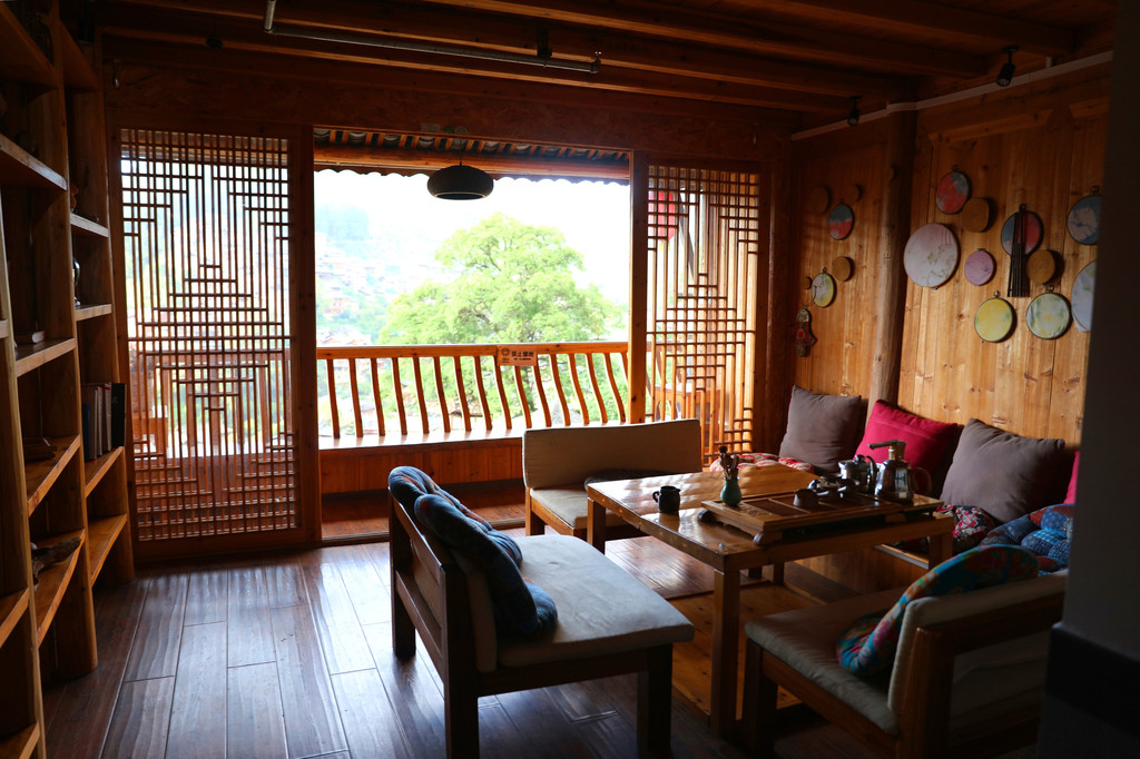 因为我们预订的客栈位于苗寨内的一高处,客栈管家事先已告知我们尽量不要带大件行李入内,反正也就住一晩,我们带了一点必需换洗的东西轻装入寨,乘观光车来到管家告诉我们的终点站一号风雨桥前面的望月客栈路口,先让司机放我们下车,一看有我们今晚入住的陌上花开客栈路牌,然后致电客栈管家,一会儿管家就过来帮拿行李和引路。来西江千户苗寨看苗寨全景及苗寨的万家灯火是一项重要选项,而且一定要选一高处才能看的全面,看攻略介绍观景台附近山上是观整个西江苗寨的最佳处,我们在苗寨内众多的宾馆、客栈、民宿中选择了花筑品牌的陌上花开客栈,确实这家陌上花开客栈真是一个可爱的去处,它有绝佳观景位置,在客屋里就可以观赏到苗寨全景,客栈同时配有公共书吧和观景台,一看这配置,我们觉得选对地方了。