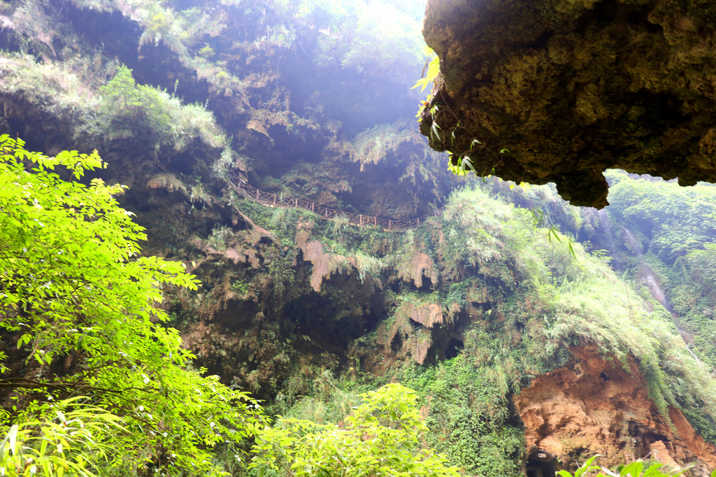 从我们入住的多彩贵州城融山酒店至安顺龙宫景区大约二个多小时,大部分是高速公路,最后十多公里是山路,从贵阳过来的车停在龙宫景区“北门”游客中心,然后坐观光车到“东门”附近,下车后仍需步行约一公里后才正式开始游览“龙宫景区”。龙宫景区集溶洞、峡谷、瀑布、峰林、绝壁、溪河、石林、漏斗、暗河等多种喀斯特地质地貌景观于一体,是喀斯特地貌形态展示最为集中全面的景区,被誉为“天下喀斯特,尽在龙宫”。我们走入景区的第一个景点就是卧龙桥,卧龙桥为横跨于明湖之上的梁式桥,因桥下湖水中怪石犹如巨龙潜底,显头露尾而得名。小桥卧波、潜龙蜿蜒,白浪翻滚,美妙壮观。卧龙桥下的明湖为龙宫暗河水系的终点,又因其湖水澄净无暇如明镜得名,是典型的喀斯特湖泊。湖中奇石林立,似龙子龙孙、虾兵蟹将嬉戏游玩,湖岸秀野苍幽、瀑水飞珠溅玉,宛如群龙迎宾。继续往前走湖的尽头洞穴就是“龙门飞瀑”,龙门飞瀑由天池水倾泻而成,是典型的喀斯特暗瀑,洞高50米,瀑高38米,宽25米,是中国最大的岩溶洞穴瀑布。龙门高悬形似天窗,流水劈石钻出喷泻而下,捣珠喷玉,气势磅礴,为龙宫著名景观之一。龙门飞瀑瀑布落差虽然不大,但是水流非常湍急,轰隆隆的水声加弥漫的水汽让人不敢多停留,看完这个“龙门飞瀑”,看游览指示牌,接下来就是游览龙宫景区的精华“一进龙宫”,进一进龙宫需至刚才看到的龙门飞瀑上方天窗处天池乘船前往,去天池有二个办法,爬山和乘电梯,为省时省力,我们当然选择乘电梯,买了来回程三十元电梯票直接去天池码头乘船去一进龙宫,龙宫景区的核心其实是一进,二进龙宫,一、二进龙宫被誉为全国最长、最美的水溶洞,其中一进龙宫长840米,由群龙迎宾厅、浮雕壁画厅、五龙护宝厅、水晶宫、高峡幽谷宫五个部分组成,乘船穿行于溶洞暗河之中,头顶斑斓的洞中奇景若绚丽的夜空,与平静水面的倒影交相辉映。我们乘坐的小船穿行在溶洞暗河之中,溶洞中大的空旷处比电影院还大,而狭窄处人得低头侧身才能免强通过,洞内景观粗旷,钟乳怪诞,如刀劈似斧削,潭深水幽,曲折神密,水幕电影光怪陆离,船行其中恍如“时光隧道”,妙趣横生。来到一进龙宫尽头,弃舟登岸,沿着长长的浮桥,四周一片潺潺流水声,晃晃悠悠走到前方又听到隆隆的水声,这里又有一惴急的瀑布,再往前走就是二进龙宫了,二进龙宫大门紧闭,旁边一告示牌上写着近日因水位太高,二进龙宫关闭。我们只得从二进龙宫旁边门口楼梯往上爬,走过一室外长廊,洞外的温度与洞内相差很大,本想在此休息一下,这体感实在不舒服,决定一鼓作气去不远处的虎穴洞避避暑气,虎穴洞为旱溶洞,长400米,因洞内有石似虎而得名,千姿百态、瑰丽多姿的钟乳石、白龙公主和布依少年的唯美爱情故事,形成了大刀断瀑、鸳鸯柱等人文与自然相融的景观,在各色灯光的映衬下流光溢彩,让我们不得不折服于大自然的神奇。虎穴洞从入洞口至出洞口其实高低差还是蛮大的,因在黑暗封闭洞穴处活动,四周看不见参照物,爬得只觉得自己气喘吁吁,而且洞中没有刚才一进龙宫洞内凉爽舒适,爬出虎穴洞,指示牌上写着向前龙腾堡,观音洞,漩塘等景点,不过酷热难耐,又要爬山,而且看来还不近,一看时间从进景区已将近二个多小时,因为我们今天下午还准备要去游览黄果树瀑布,决定到此为止,选择从一进龙宫处乘船返回,回到天池码头,从这里可以看到一大豁口,天池的水从这湍急而下,原来这里就是龙门飞瀑的源头,这大豁口就是从下面看到的天窗。我们花了三个多小时游完龙宫景区的一部分,攻略上写的二个小时可游完龙宫景区不可能,如果完整地游完景区全部,起码需要一整天。