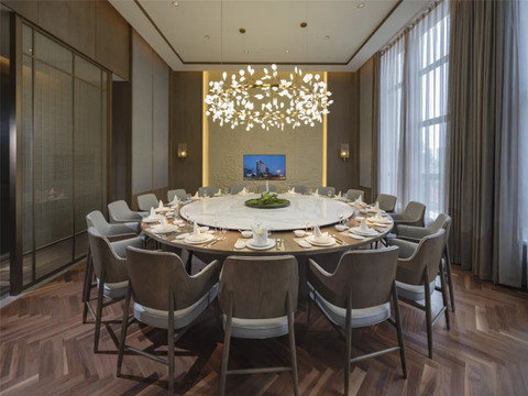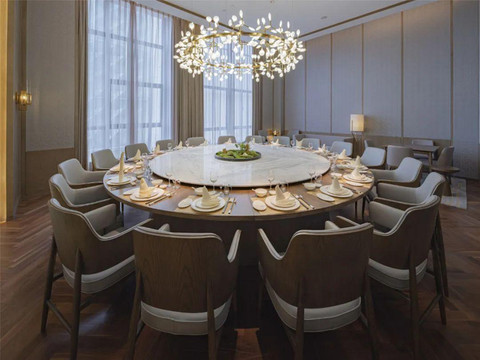 国风堂包厢位于酒店二楼,拥有风格迥异的豪华餐包厢13个,环境静谧典雅。高端的实木餐桌/椅、覆膜大理石转盘,简约奢华的装饰搭配,给到宾客们高贵的用餐体验。