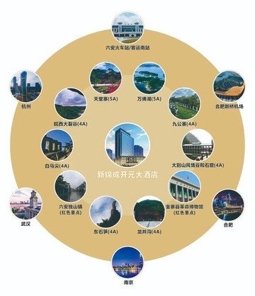 酒店区位交通便利,地处六安经济开发区,距中心商圈、万达广场约10分钟车程。距离合肥新桥国际机场大约50分钟车程,京台高速公路近在咫尺。距离酒店1小时车程内有2个5A级景区,6个4A级景区,距大湖名城合肥仅1小时车程。