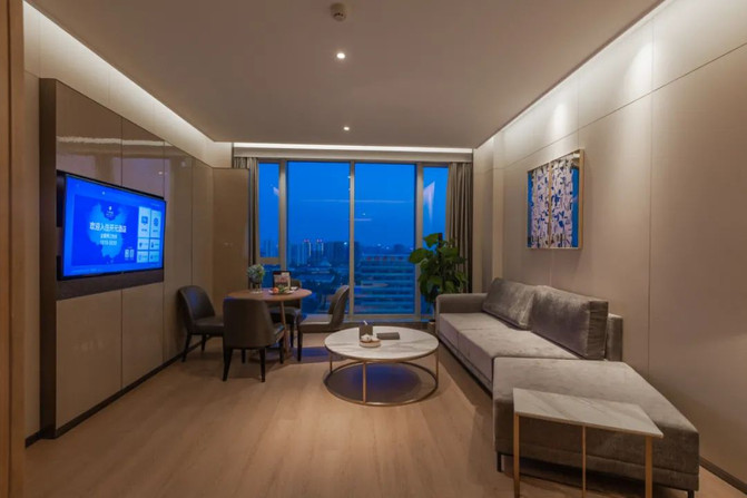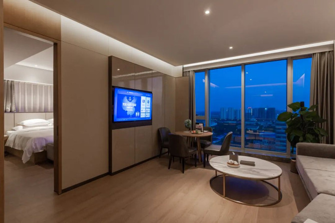 套房采用全视角落地玻璃窗,宾客可览日月星辰、都市夜景。而宽敞的客厅与卧室隔开,给到宾客更多的活动空间。