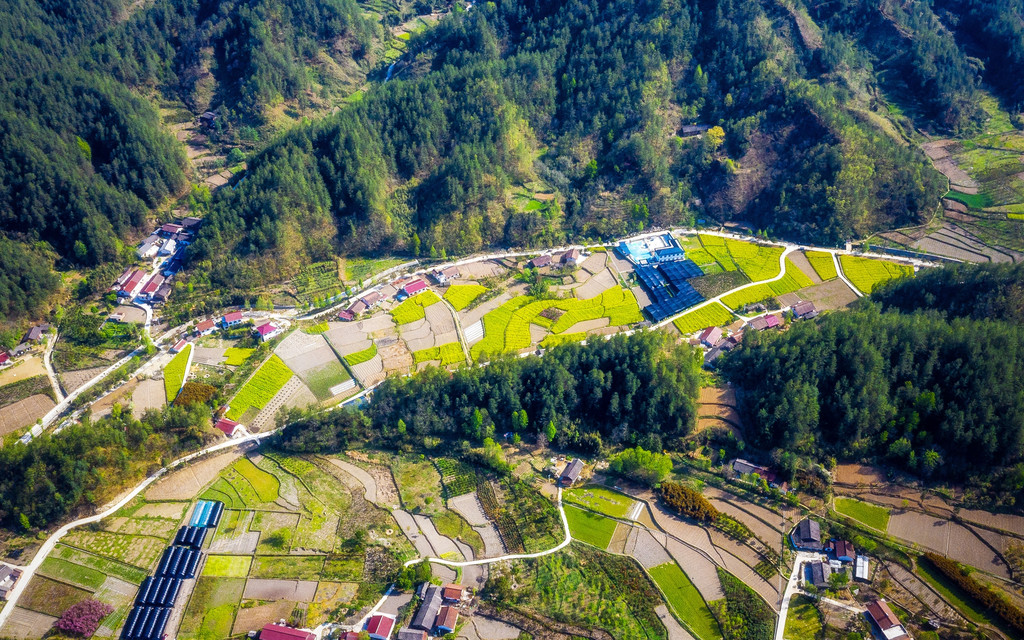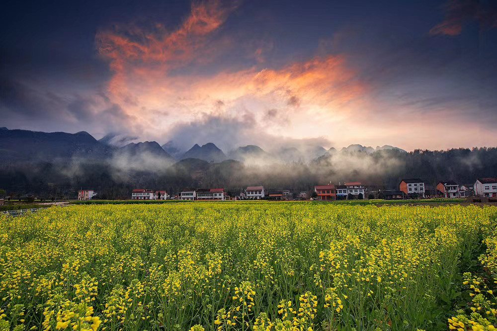 山坡上小小的村庄被花海包围着,烟雨朦胧的季节或是一抹斜阳的午后,一眼望去,宛若遗世独立的桃源胜境。
