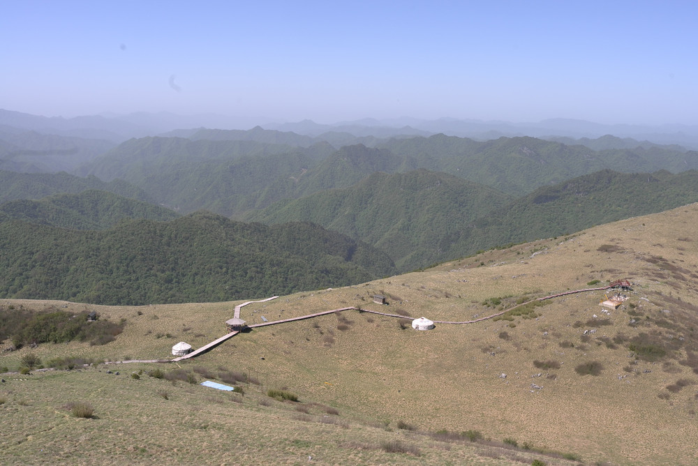 下索道后就是步道楼梯,楼梯一直修到半山腰,爬起来相当累,中间有两个亭子,可以稍作休息,其它地方,就要爆晒在阳光下。网上介绍说,紫柏山有九十二峰,八十二坦、七十二洞,风景如画,景区集高山草甸、珍奇动物、稀有植物、原始森林,峰、岩、洞、坦、泉、溪与峡谷为一体,素有“黄山归来不看岳、九寨归来不看水、紫柏归来不看草”之说。估计是我们去的季节不对,虽能看见远处群山叠嶂,但近处的草没什么看头,山上有一些像锅一样的坑洼区域,就叫做坦。
