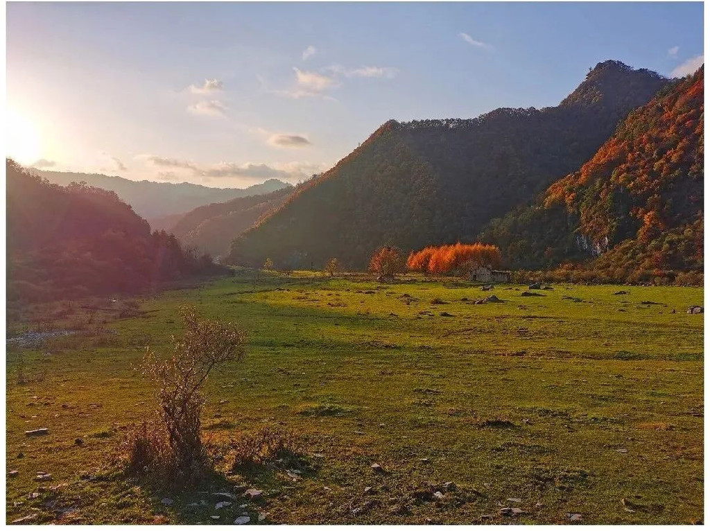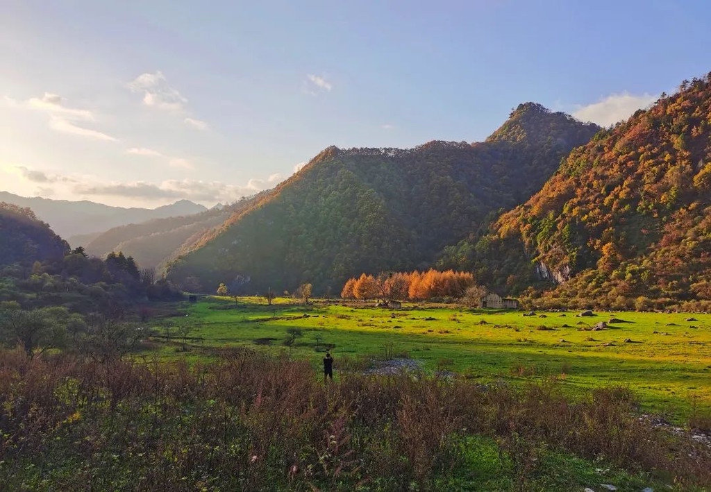 夕阳西下,光线柔和,天晴云稀,造就了眼下如电影画面一般的美景。我国的草原牧场大多位于西北,西北干旱少雨,草原广阔的地方一般是灌木、乔木的禁区,所以常见的草原总是与童山荒岭为伴。而这片草原地处秦岭南麓,气温舒适,雨水充沛,使得植被垂直带尽聚一处,盎然绿意从脚下的草甸一直延伸到远方的山巅天际,这是动画片里才有的景象吧!