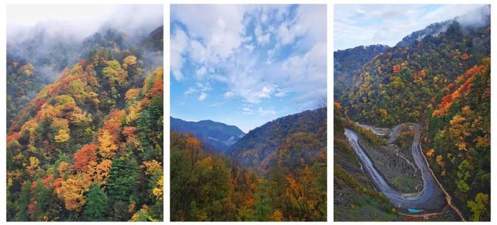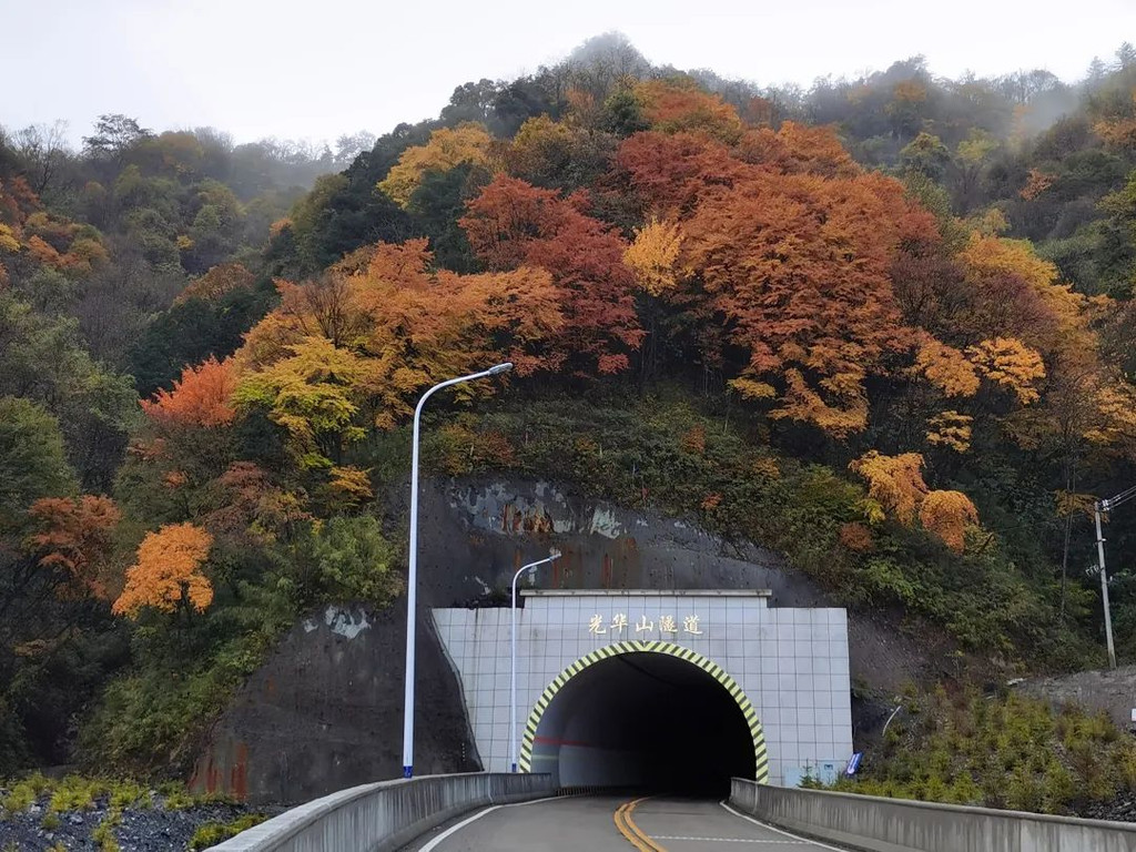 尤其是到达隧道口后,天气短暂放晴,云开雾散,且高处视野极佳,漫山遍野的彩林如刚洗过一般,明艳欲滴,蓝天白云清新爽朗,冷色暖色相映相辉,林间缭绕些薄薄雾霭,略显氤氲,气氛神秘,简直是一座人间仙境。